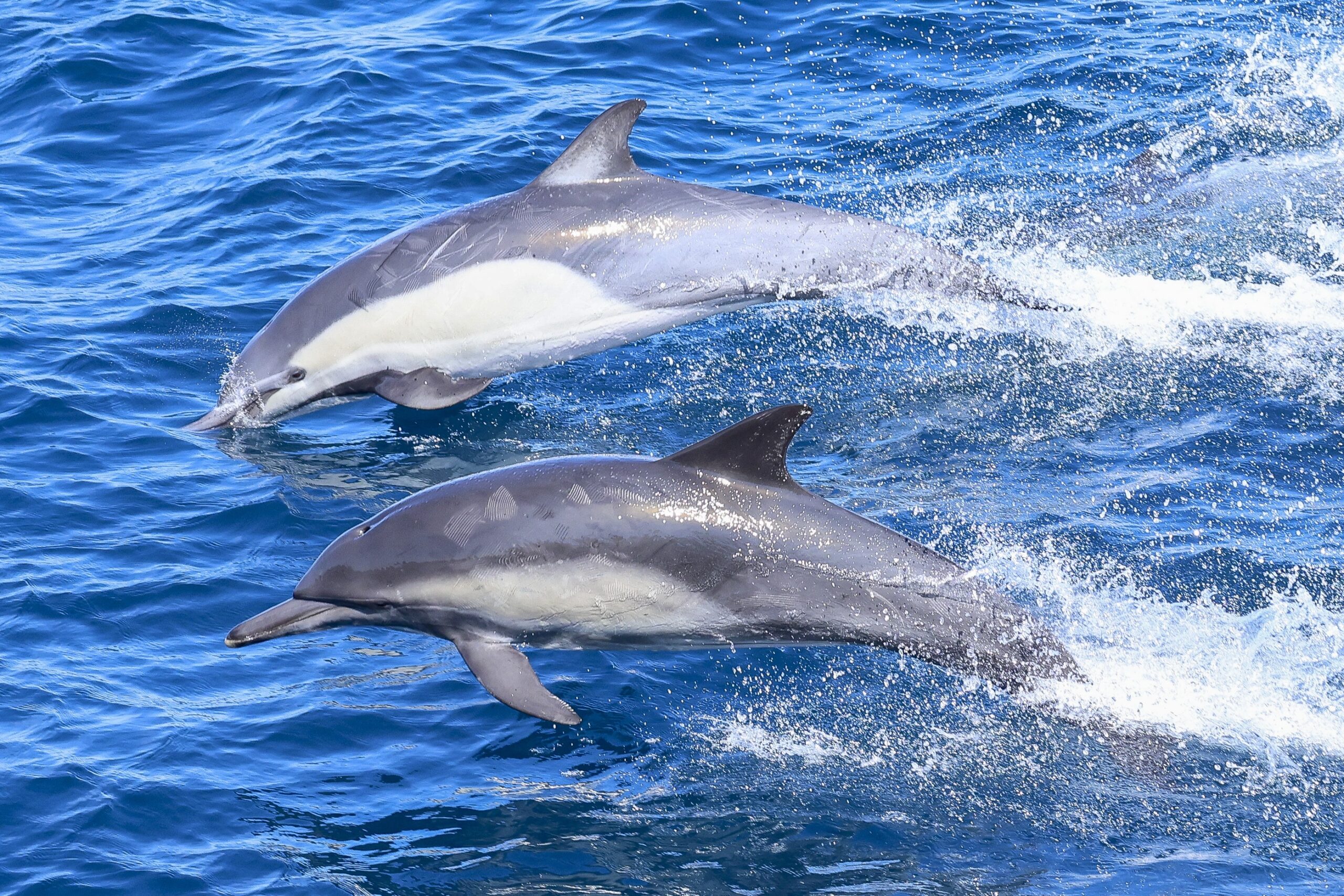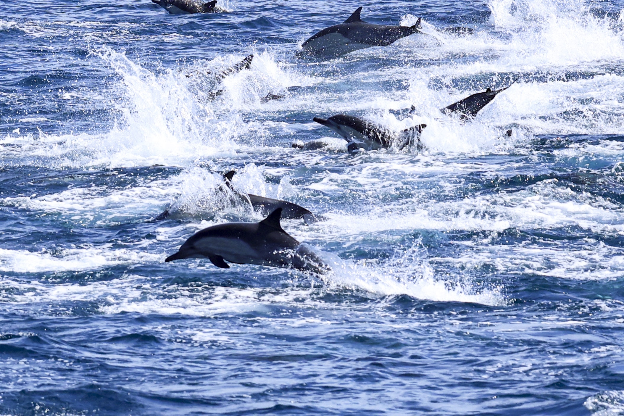 Captain Michael pushed us up to the northwest to the Scripps—San Diego submarine canyon off the coast of LaJolla and Scripps Institution of Oceanography. We actually got up to Los Peñasquitos Lagoon, part of Torrey Pines State Natural Reserve and the uplifted marine terrace sedimentary layers beneath the homes of Del Mar. After turning around, we spotted some splashing of water on the horizon and spent time with the long-beaked common dolphins, around 300 of them, looking for their next meal and foraging the vast Pacific Ocean. It was a glorious sight, with the phantasmagorical scintillating seas and dancing waters churned up the the 200–300 pound dolphins.