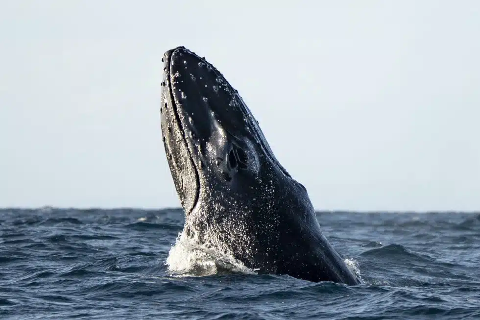 - Dramatic surface activity including breaches, tail slaps, and mugging behavior