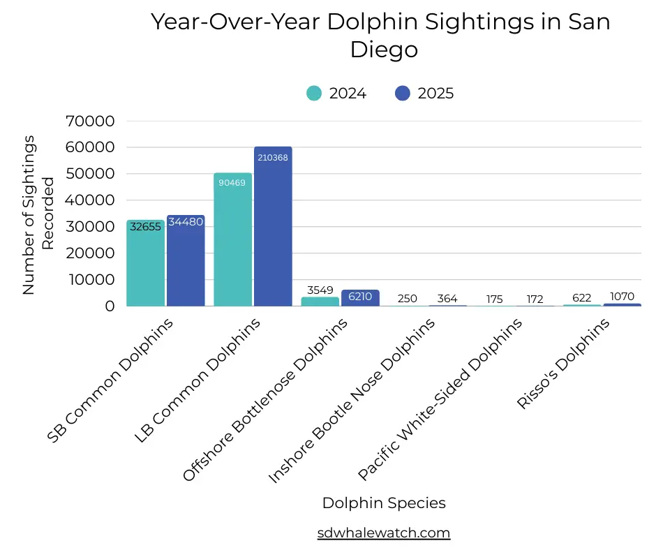 Dolphin Sightings by Species During San Diego Whale Watching Tours (2024 vs 2025)