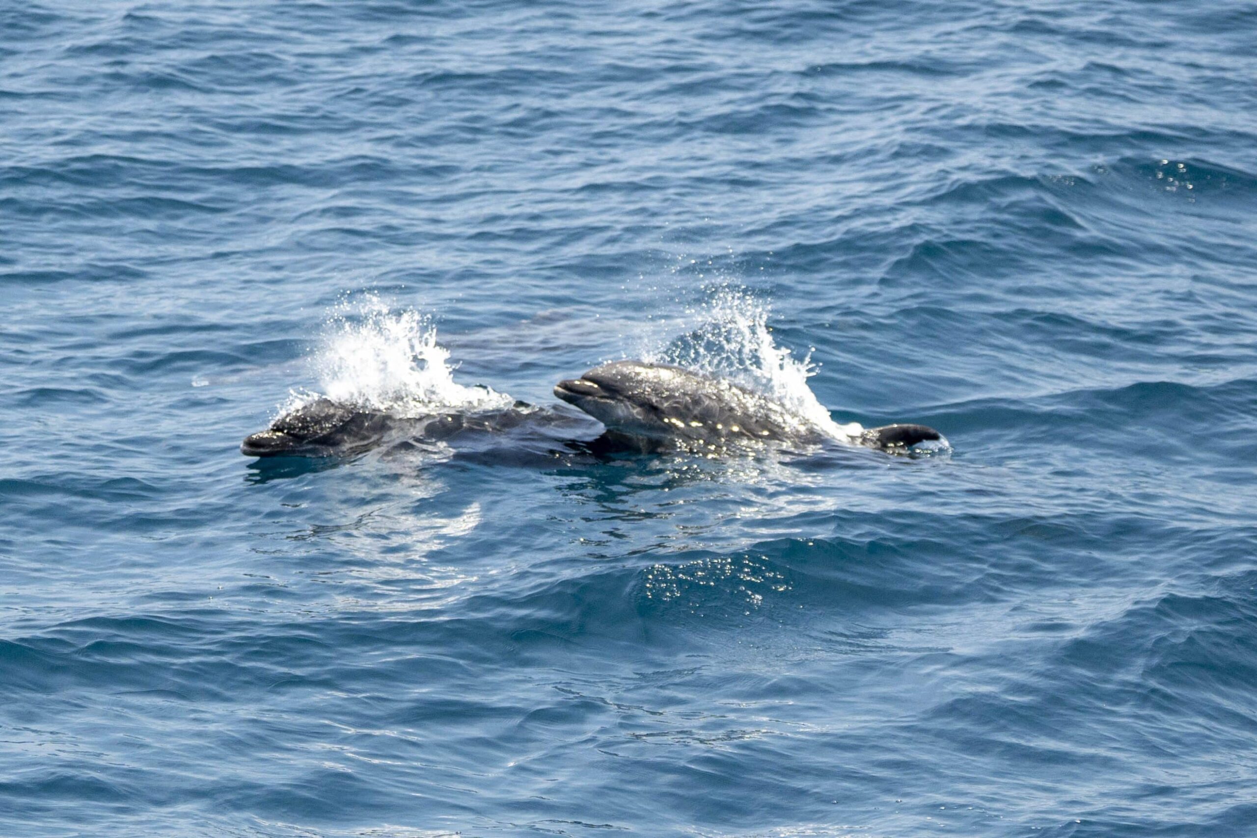 This afternoon, we set back out on glassy seas and parting clouds made for stunning blue skies and saphire blue water. We found a couple pods of offshore bottlenose that were boisterous and so curious about us! They would zoom up to the bow swimming with their bellies pointed at the boat so they could eyeball all of us on the boat, a few seemed to be “wrestling” ramming into each other and leaping into the air repeatedly.