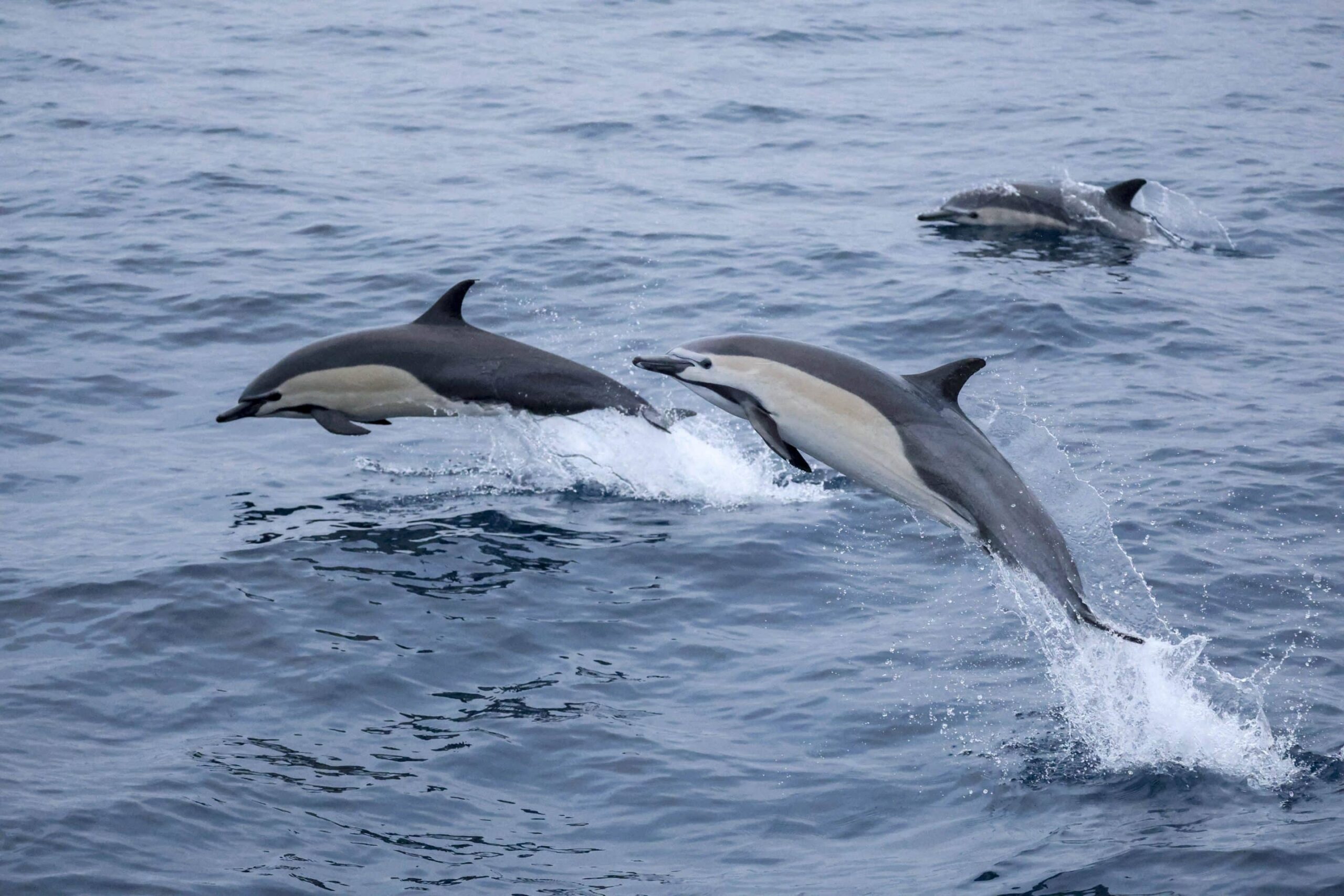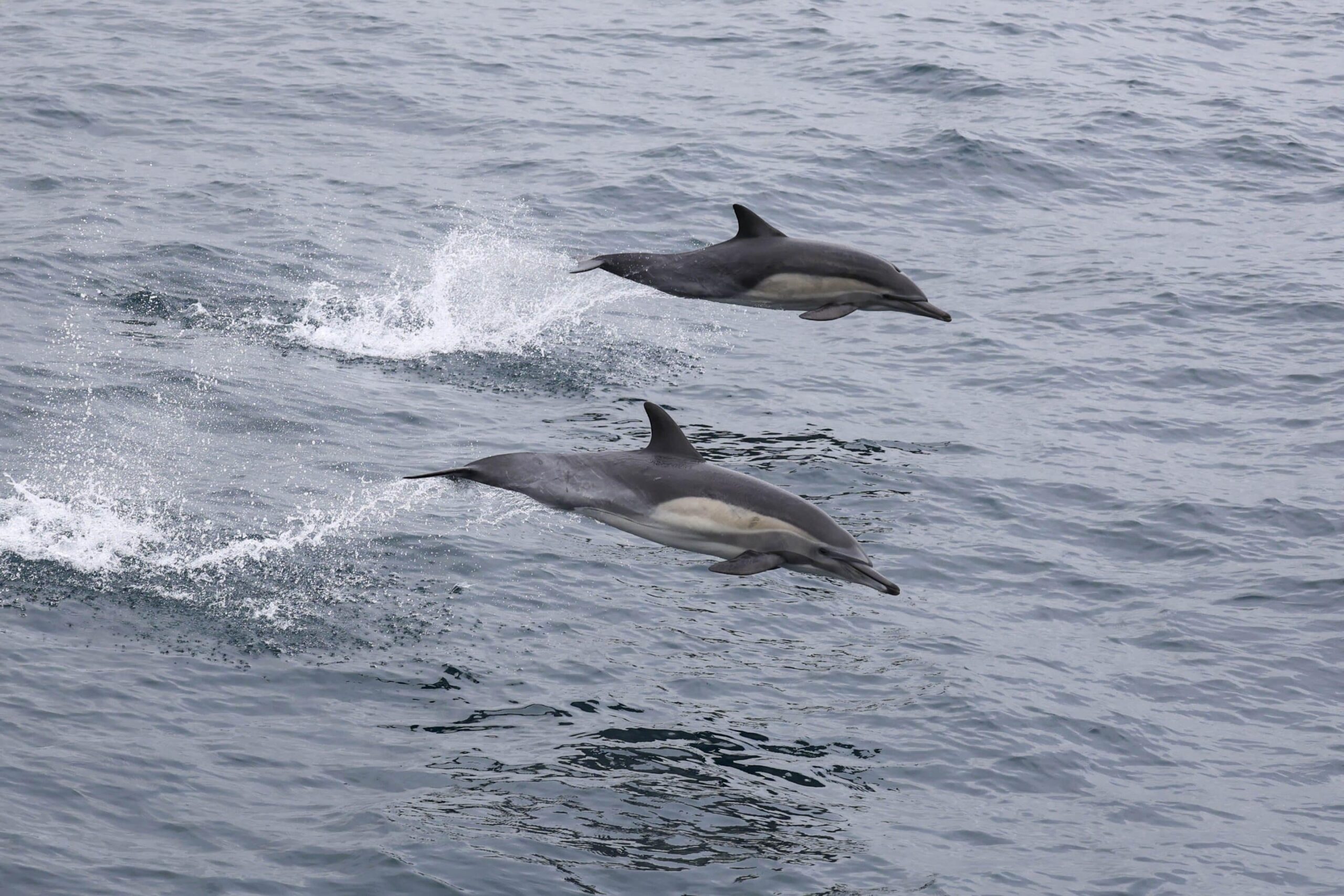 The seas were up and so were our spirits! We were excited to out on the Pacific to find wildlife today! On our sunset trip, we caught up with two fun pods of Common dolphins! Right of the bat, we sighted a bunch of birds diving only a couple miles from shore just outside of sunset cliffs. There were about 250 Long-beaked Common dolphins cruising to the north. They were’nt to busy to come and say hi! We watched as they raced up to the bow and surf in our wake! With the bigger swells today, we could see them surfing those waves as well! They were spread out over a half mile and continued up the coast as we went SW. We got the drop-off and followed that for a bit to the south before we hooked it out to the 9-mile bank. We spotted shearwaters, terns and plenty of storm petrels nearby flying in and out of the waves. We got to 14-miles from Mission bay and hooked it to the north. Out in the distance we spotted some splashes that after awhile realized they were more Commons! There were ~250 Short-beaked Common dolphins launching out of the water, breaching, porpoising and playing in the big waves! We had encountered an awesome and probably the largest nursery pod we’ve seen in a long time! It was so funny to see the little flying “footballs” or calves doing their best to keep up with their mommas! They continued to the south while a few escorted us toward the coast. The cherry on the top was the beautiful sunset! The sun peaked out from under the dense cloud cover and went back down beyond the marine layer formed on the horizon!
