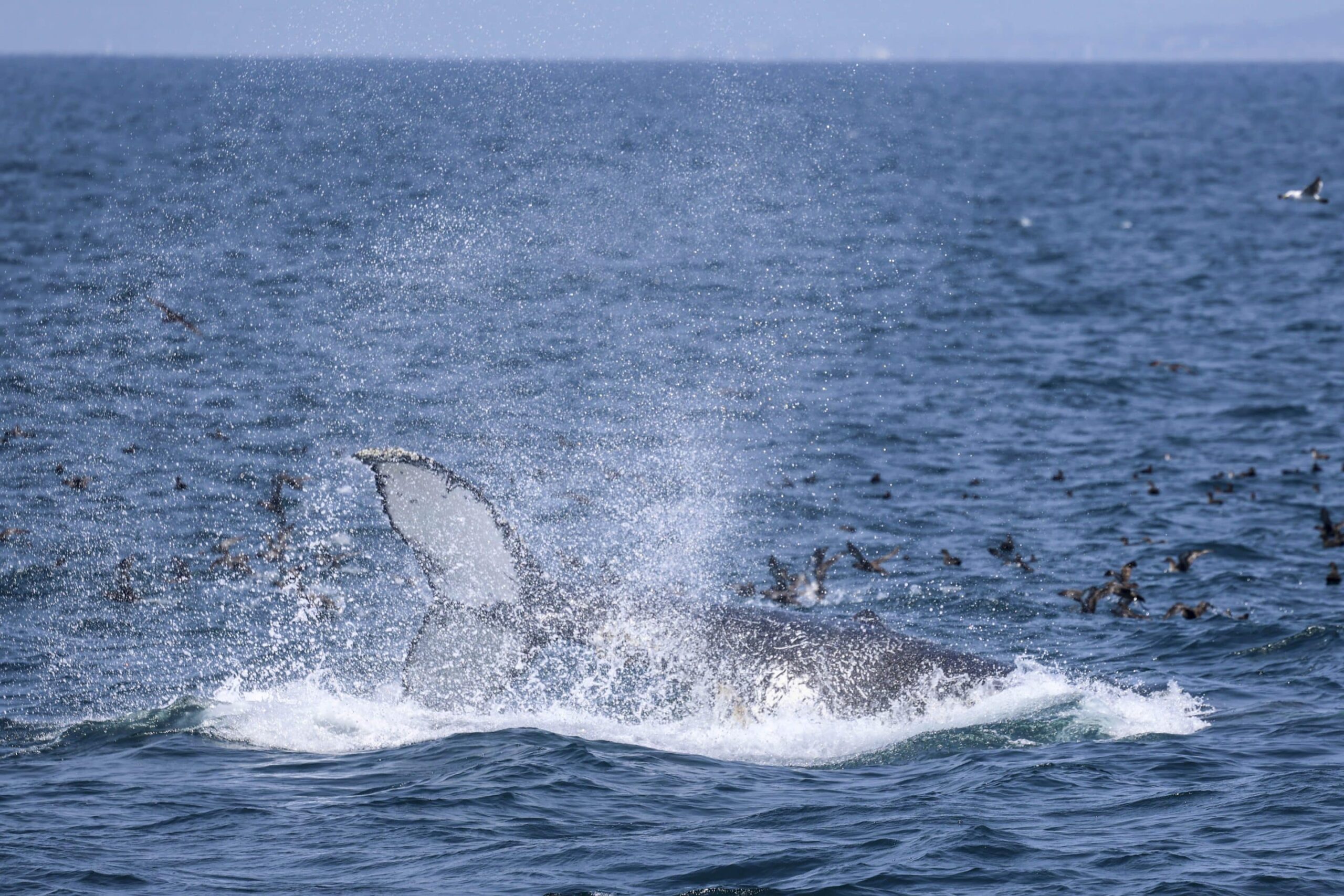 We had two more AWESOME trips! On our afternoon trip, we zoomed to the south and and caught up with ~600 Long-beaked Common dolphins that were split into a few different pods! Out in the distance there were so many more dolphins to the south, with an estimated ~2000 in total! They were friendly and fun! We spotted a pair of Humpback whales that were following all the Common dolphins! One the humpbacks had a beautiful bright white tail that seemed to be very energetic! We observed it tail-lob several times! The Humpback had a darker tail and was a bit more mellow, but did show us a couple tail slaps! All the action was ~12 miles to the south only half a mile from the Mexican border!