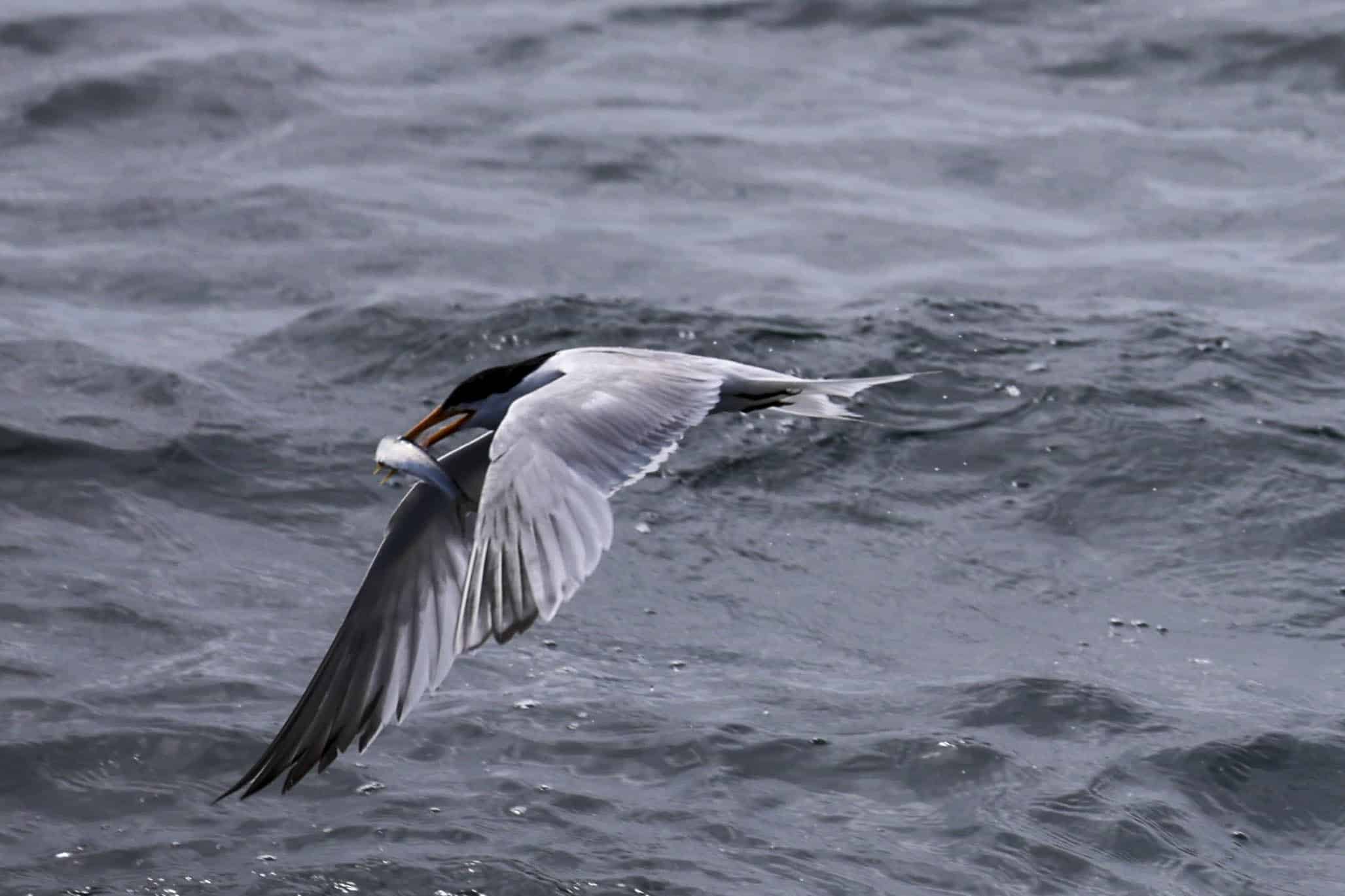 On our afternoon trip, Captain Michael brought us south past Point Loma where we have had recent Humpback Whale sightings. We encountered a small pod of Common Dolphins that took a break from foraging to come say “hello” to our passengers several times before returning to foraging. We had hundreds of Elegant terns plunge diving right beside the dolphins, feeding on the small anchovies. Nearby, we saw a small three foot long blue shark in the surface waters that the dolphins briefly harassed. We continued south and west, seeing the Coronado Islands of northern Baja California, Mexico. On our way back, we found another pod of common dolphins chasing the forage fish in small baitballs just two miles outside of the Mission Bay Channel entrance. This afternoon, none of the numerous whale watching boats on the ocean found any of the baleen whales. We did enjoy the scenery and weather with the sunny skies in Americas’ Finest City, San Diego.