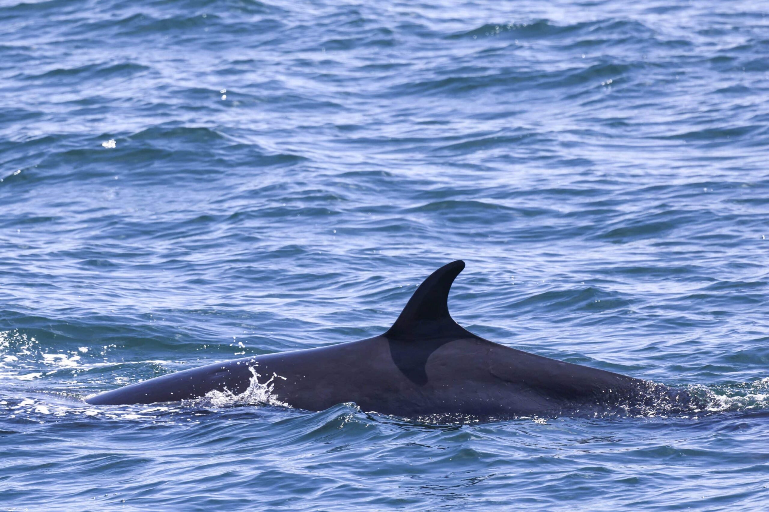 Several miles offshore, we found what fisherman refer to as a baitball, where schooling or forage fish such as the anchovies and sardines, both planktivores, come to the surface and are in turn eaten by seabirds and dolphins. We saw hundreds of Elegant Terns and Brown Pelicans along with Heermans Gulls and Black-vented Sherarwaters. It was absolute mayhem for feeding by our feathered and flippered friends. It was nice that the dolphins took time out of their feeding to participate in the “human watching tour”, turning to their sides as they came up to our boats to lake a look at us cheering them on. Further offshore at nine miles and 1,400’ depth of ocean we came across a 2nd pod of Long-beaked common dolphins, about 140, chasing fish along with the terns, the latter with raspy calls. Now and then, we can hear the “signature whistles” of the dolphins along with their exhalations through the blowhole. Some of our guests on the bow spotted a Minke Whale and we got a few looks and heard one loud exhalation and saw the “fluke prints” or smooth patches of water left behind from the upstroke of the powerful tail flukes.