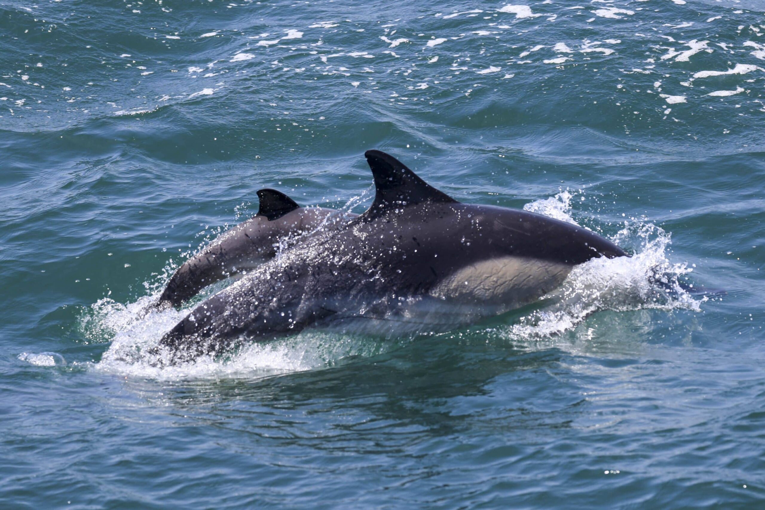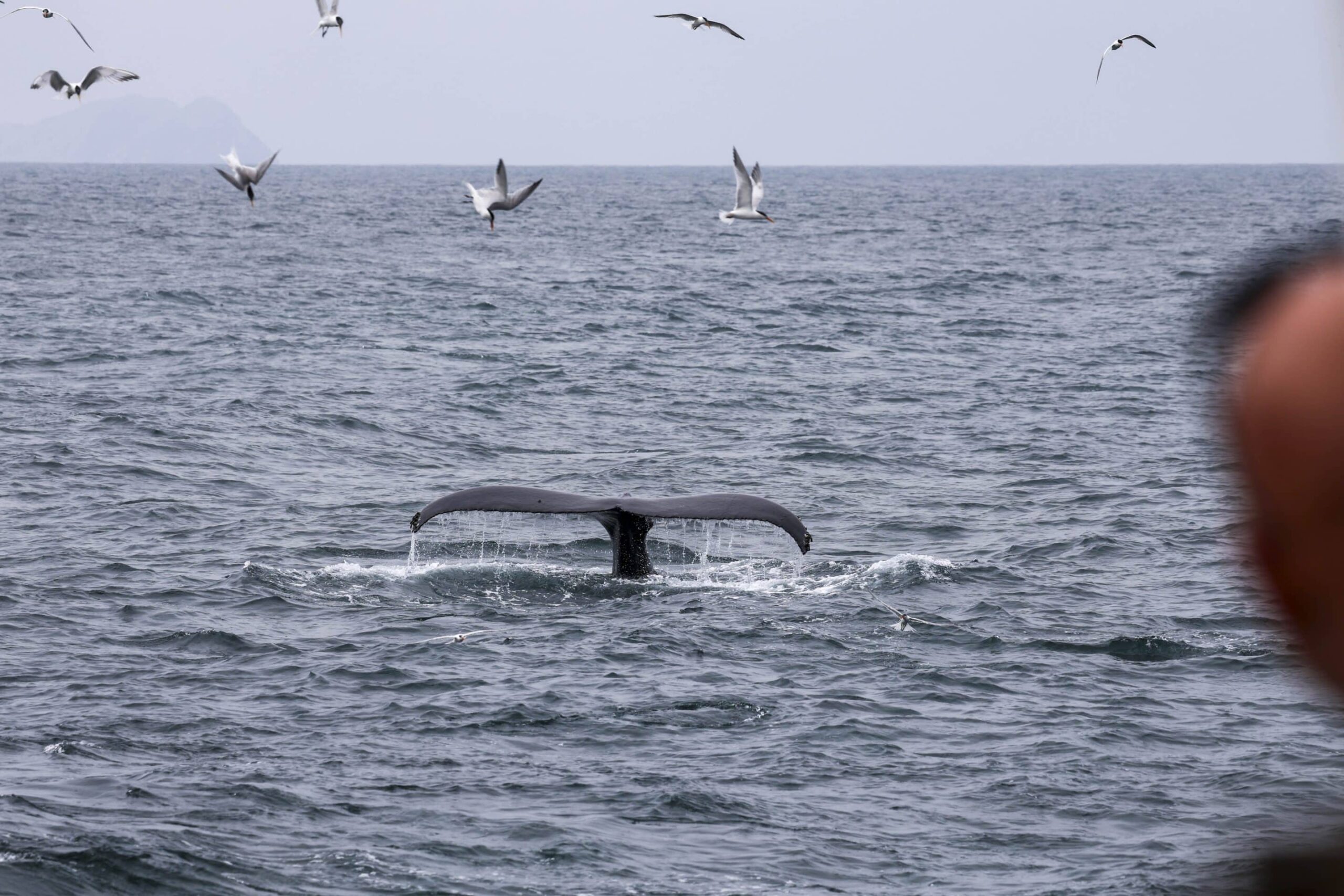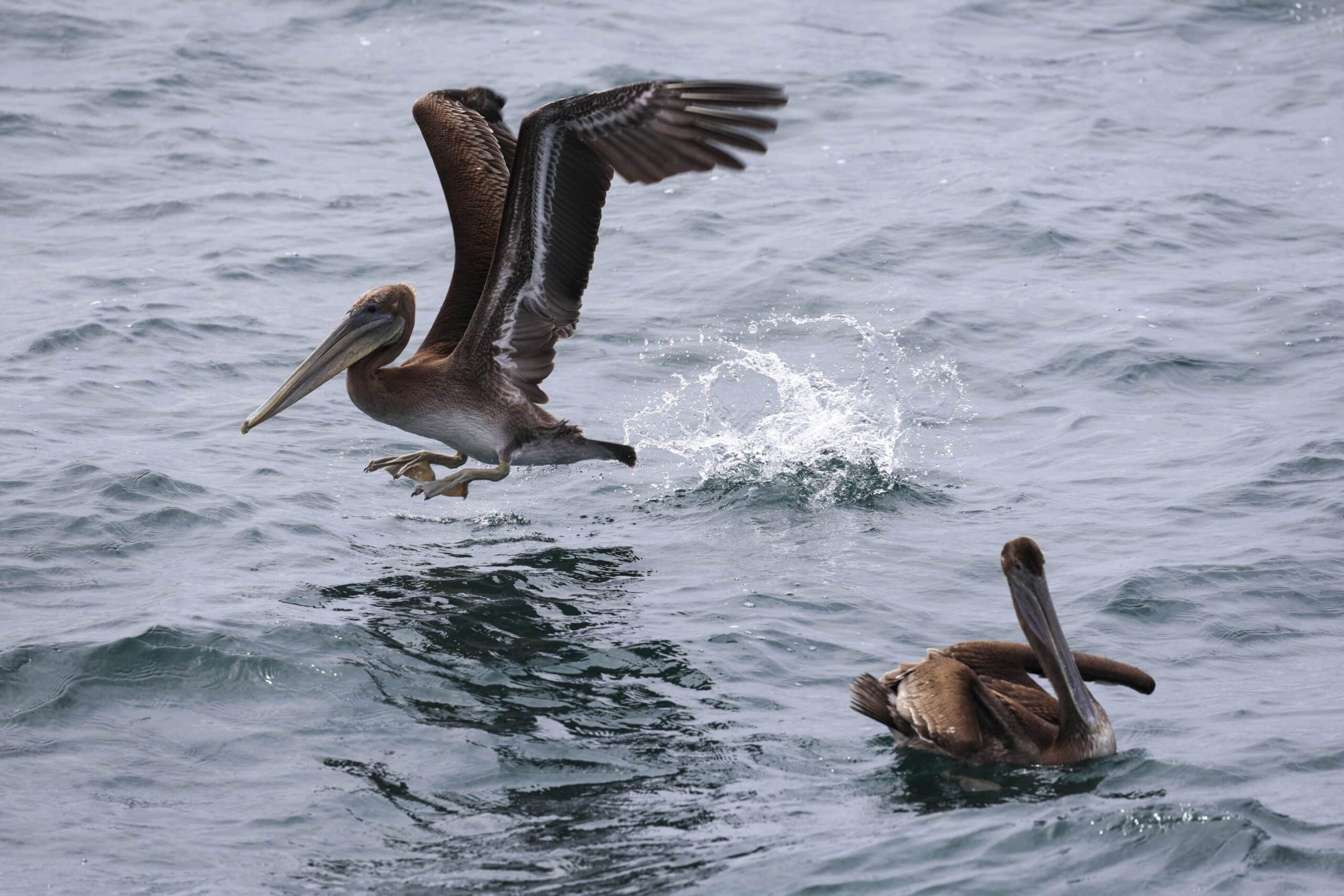 Captain Brian voyaged south toward the Mexican border for 7-miles and we came across a feeding frenzy! Baitballs of fish, likely anchovies, either came to the surface voluntarily or were forced up by predatory fish such as the mackerel & tuna. Then the marine mammals herded and corraled the planktivorous forage fish. The dolphins use echolocation and sound blasts to find and stun the fish. A humpback whale spouted, was spotted and found, exciting our guests and going from one baitball to the next, like a kid in a candy store. We saw a few lunge-feeds, where the whale rushes straight up through the fish vertically in the water column or parallel to the surface, with throat pleats expanded and fish leaping out of the water by the hundreds. Hungry gulls got the injured, discombobulated fish at the surface. We also had a few imposters, sea lions pretending to be dolphins, porpoising through the plankton-rich waters to the dark clouds of fish schools. A wild and exciting time was had on our morning tour.