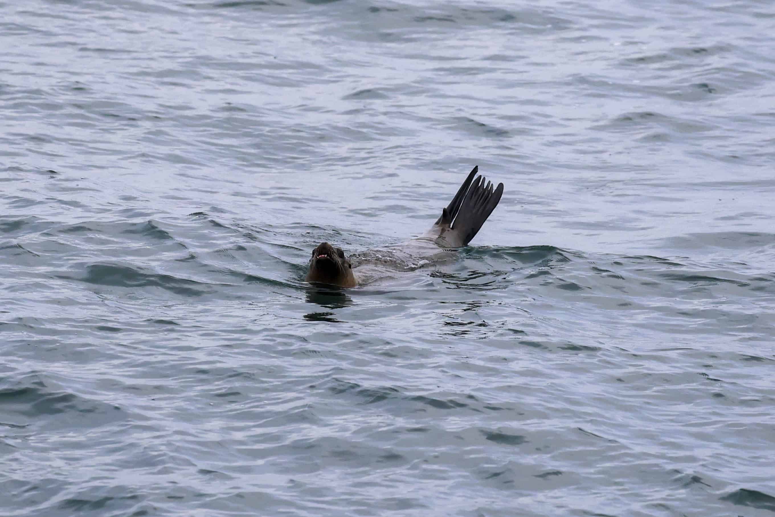 The dolphin madness flowed right into our afternoon trip!! As soon as we left the Mission bay jetties, we caught up with likely the same massive feeding frenzy only a mile from shore! Anchovies were on the menu! There were hundreds of birds diving and picking up anchovies all around us! This was our largest pod of the trip, with about 400 Long-beaked Commons sighted! We continued out and not too far from us we spotted another pod with ~300 Commons traveling to the east. They were probably headed toward all the action we had just hung out with. We spotted plenty of calves in the pods and enjoyed seeing the big breaches from the energetic individuals! We caught up with two more pods near the drop-off and the waves began to pick up out there. It looked like the Commons enjoyed surfing those waves!