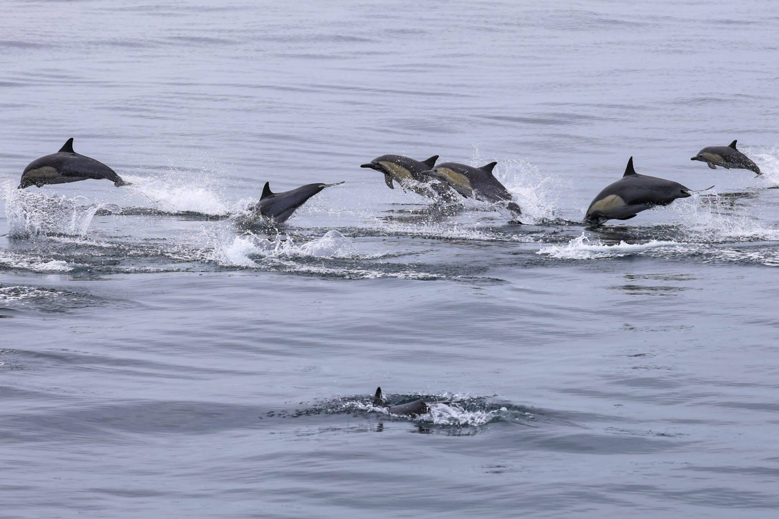 We continued N and rounded out the trip with 300 short-beaked common dolphins who put on quite the show for us! As we picked up speed to head home, so did they, and we saw a dolphin stampede! It felt like being in the middle of a dolphin popcorn bucket with them launching out of the water in every direction.