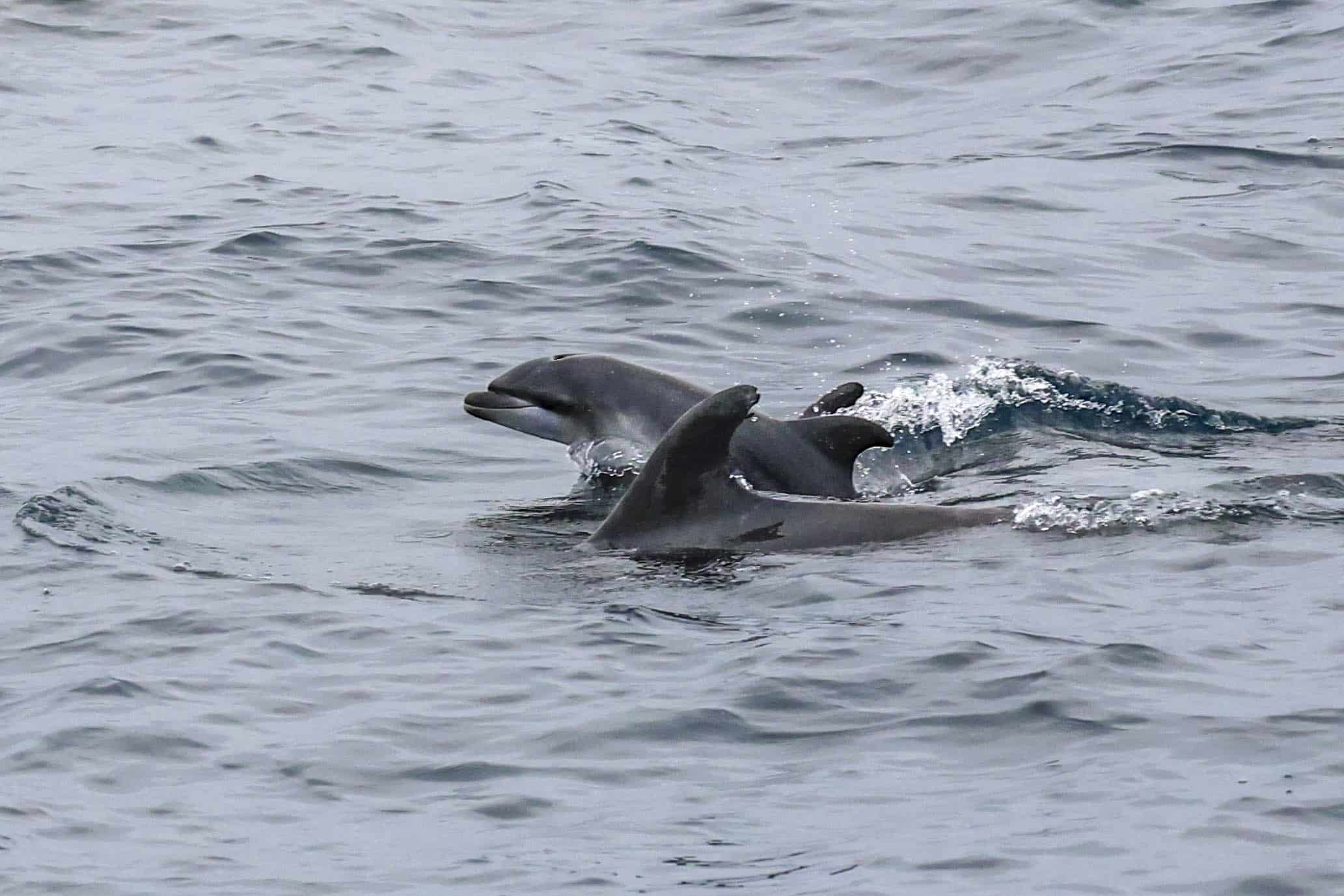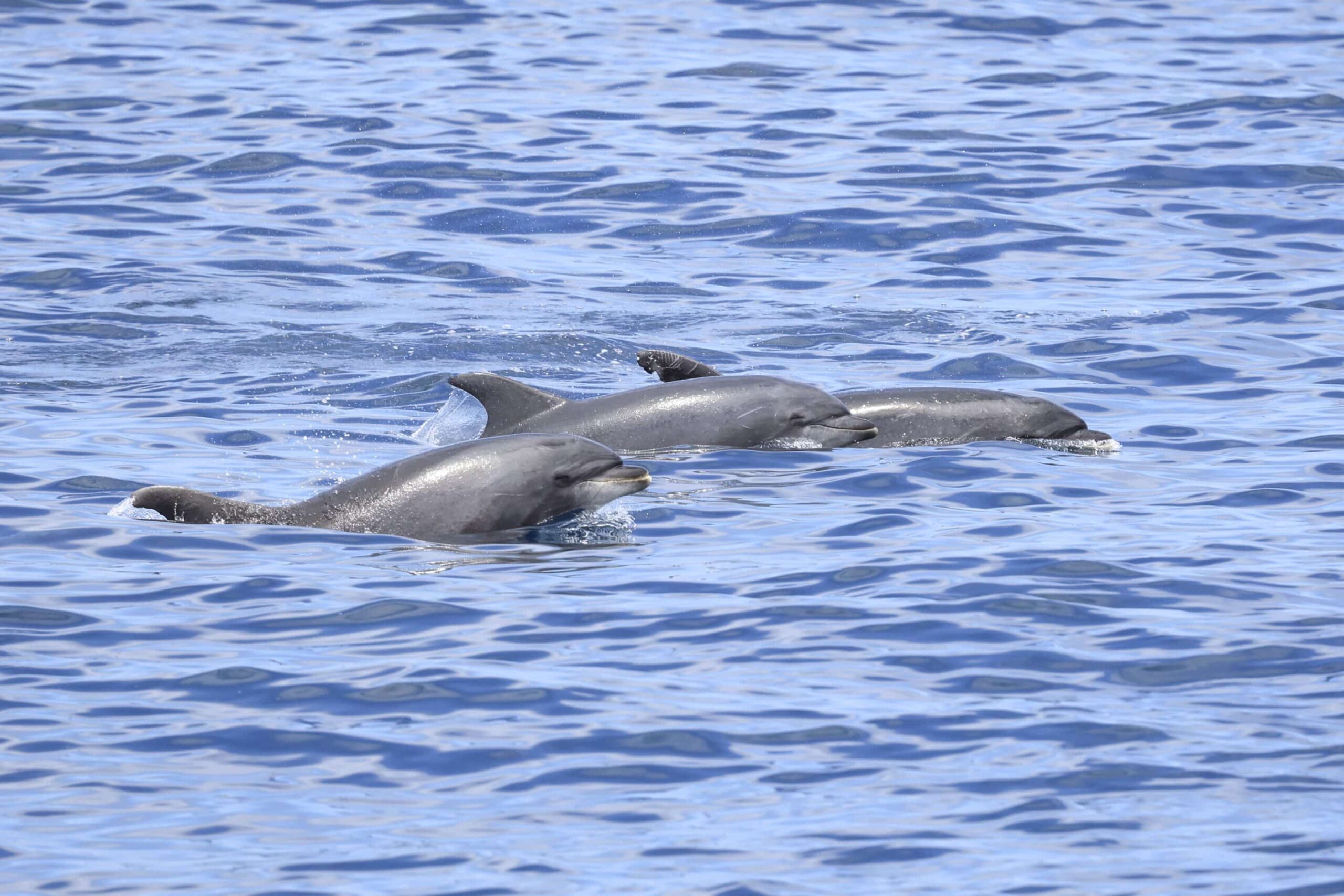 We have got STUNNING conditions out on the water so far today! Water visibility is incredible (see the dolphin shots below), with a light wind and swells less than 2ft. In some spots we’ve got some really glassy conditions. This AM we left the jetties and went straight out to a pod of 70 offshore bottlenose dolphins, who were all chasing some bait. We made a turn and continued further out to the W, eventually headed straight to the N. We found a very large pod of about 500 long-beaked common dolphins, with some of the cutest little footballs (baby dolphins) I’ve ever seen! We even observed some mating behavior, with a male dolphin swimming belly-to-belly with a female dolphin. Pretty cool!