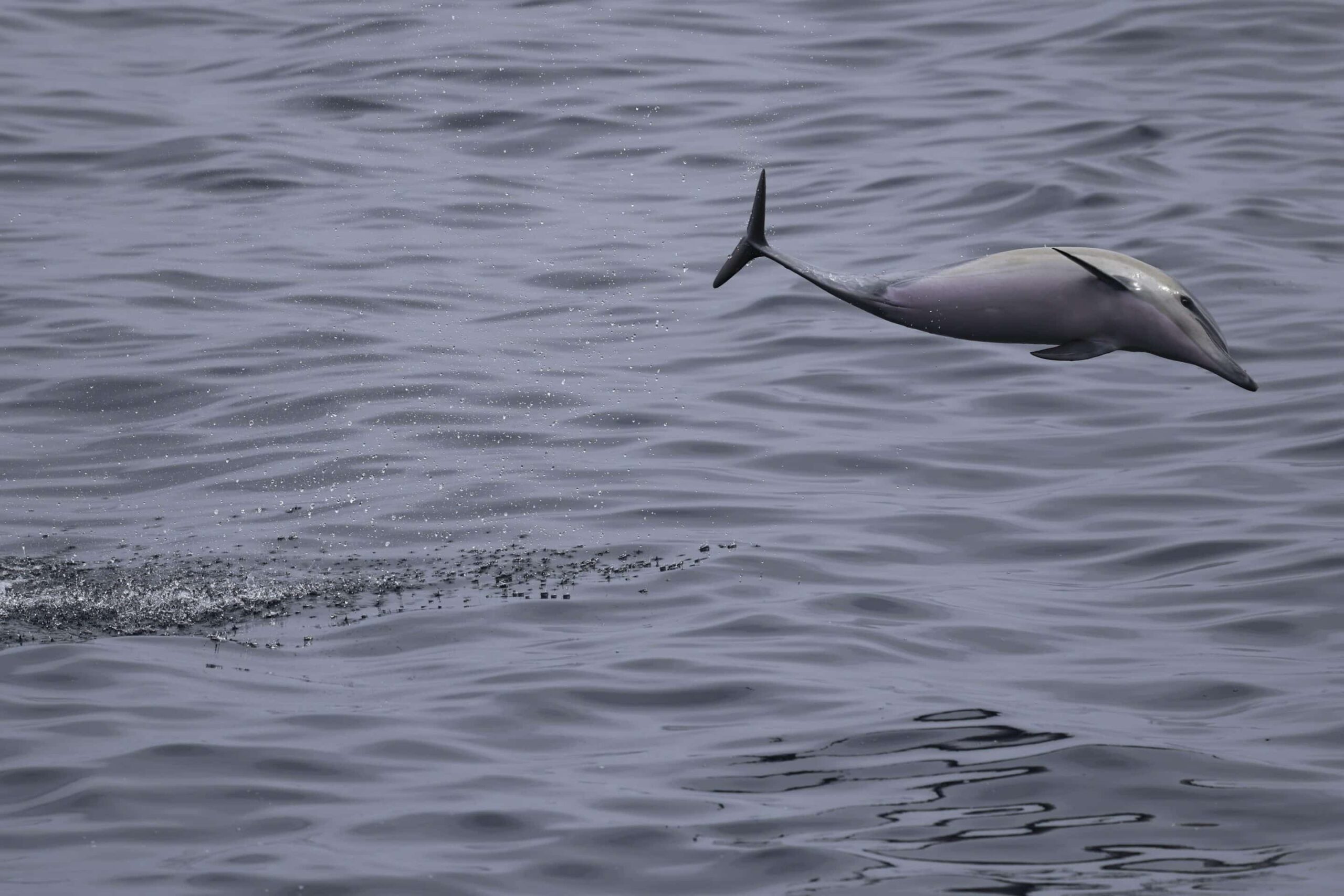 The beautiful sea conditions and amazing visibility continued into our afternoon trip! We had a triple toothed whale trip with sightings of Long-beaked Common dolphins, Offshore bottlenose dolphin, and Short-beaked Common dolphins! We found the Long-beaks at the drop-off and only spotted them by the massive feeding frenzy of birds diving with them! We got great looks as they moved from bait ball to bait ball to the SW. It felt like we were in a nature documentary with all the excitement, all we needed was David Attenborough to start narrating! We continued on to the west and spotted a small pod of ~20 Offshore bottlenose dolphin being very mellow traveling slowly to the south as well. We spotted another larger pod of ~75 Offshore bottlenose that were seen breaching and porpoising! A handful seemed to be checking us out as they lifted their heads above the water to do some people watching! Our last encounter was a super energetic pod of ~100 Short-beaked Common dolphins that were seen launching out of the water like little rockets! We caught up with them and noticed we had come across a nursery pod! We even got looks at some acrobatic dolphins with pink bellies!