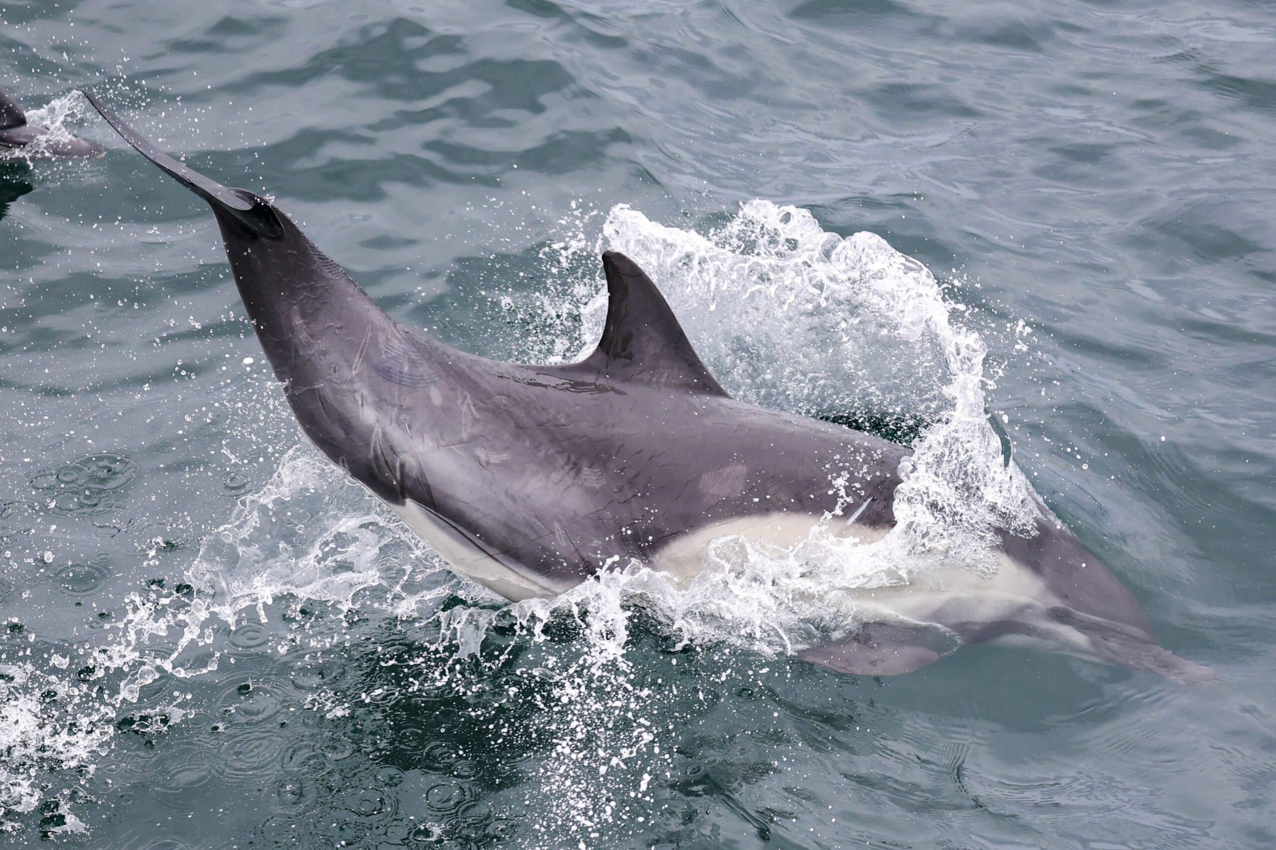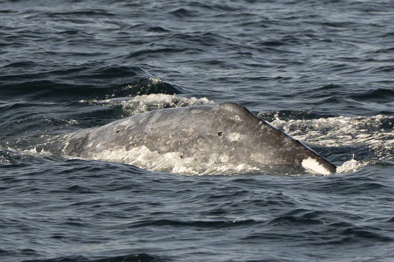 We cruised out west and saw an ENORMOUS spout on the horizon, cruised over – thinking it was likely a humpback whale – when we got there – a blue glow appeared under water and we thought – maybe a blue??? Then it surfaced and the distinct head of a gray whale gave us quite the surprise. Usually these whales have made it alll the way up to Alaska by now. Eventually a second smaller spout surfaced next to the larger one. We were all aghast. We managed to locate dolphins after that as well, a solid pod of feeding long beaks! The surfed in the wake and played exuberantly near our vessel. Our waters have been FULL of dolphins in huge numbers, we saw nearly 600 of them on our afternoon trip.