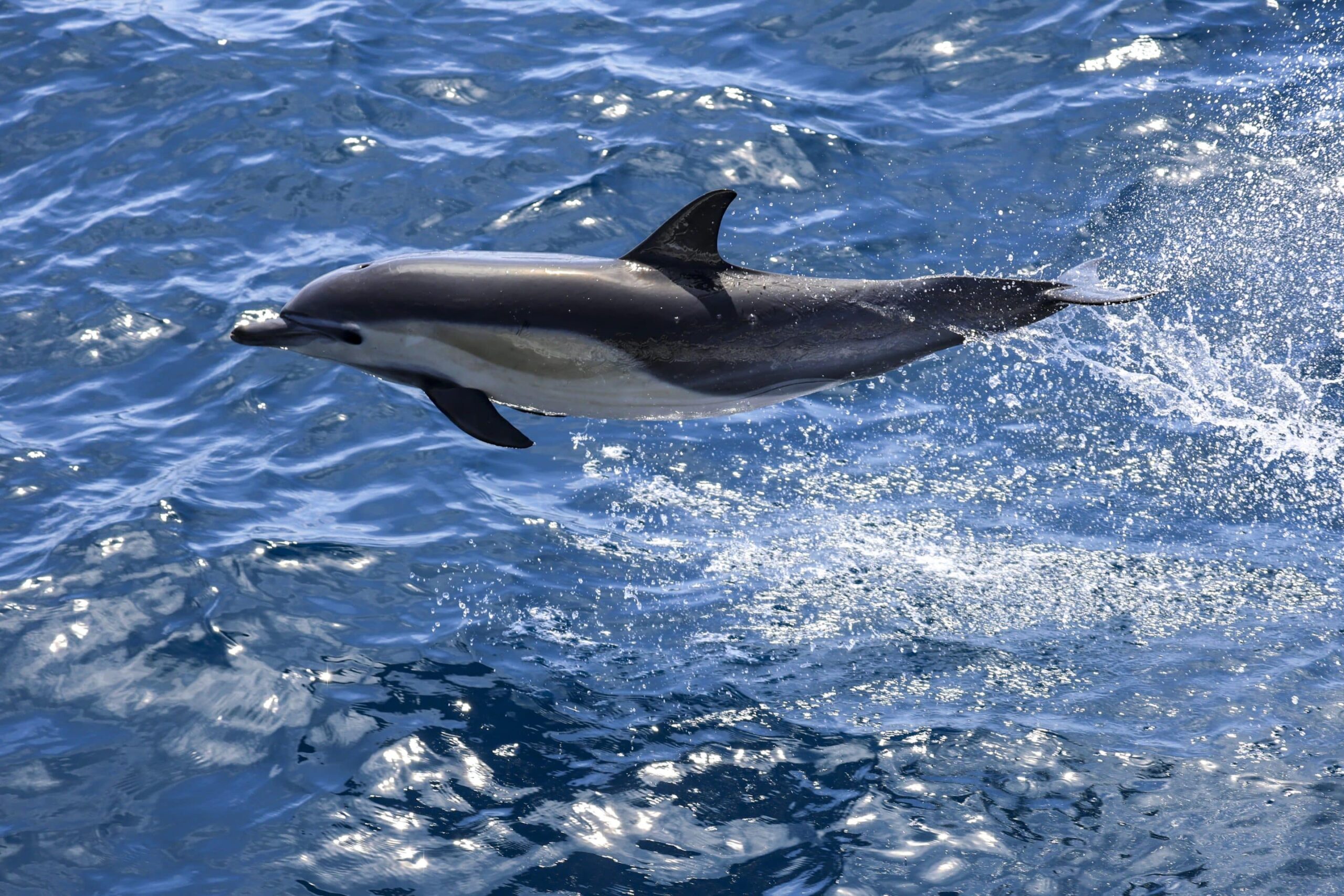 We got 12-miles to the northwest, off of Del Mar, and Captain Bryan found us a pod of about 150 Offshore bottlenose dolphins, much larger than the common dolphins. We could actually see them spouting from about 2-miles away. As soon as we turned around, out of nowhere, it seems, a huge pod of about 1200 common dolphins materialized. Somehow we did not see them on our way out. Like dogs eager to see their owners when returning home, the dolphins seemed eager to greet us and show off their consummate swimming and porpoising skills.