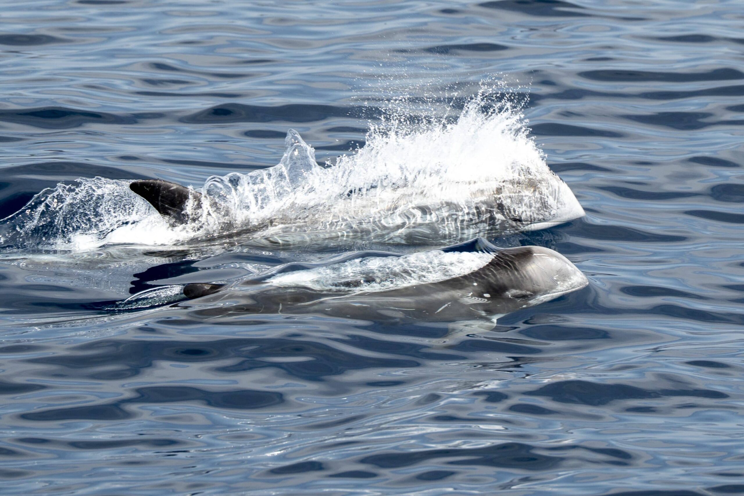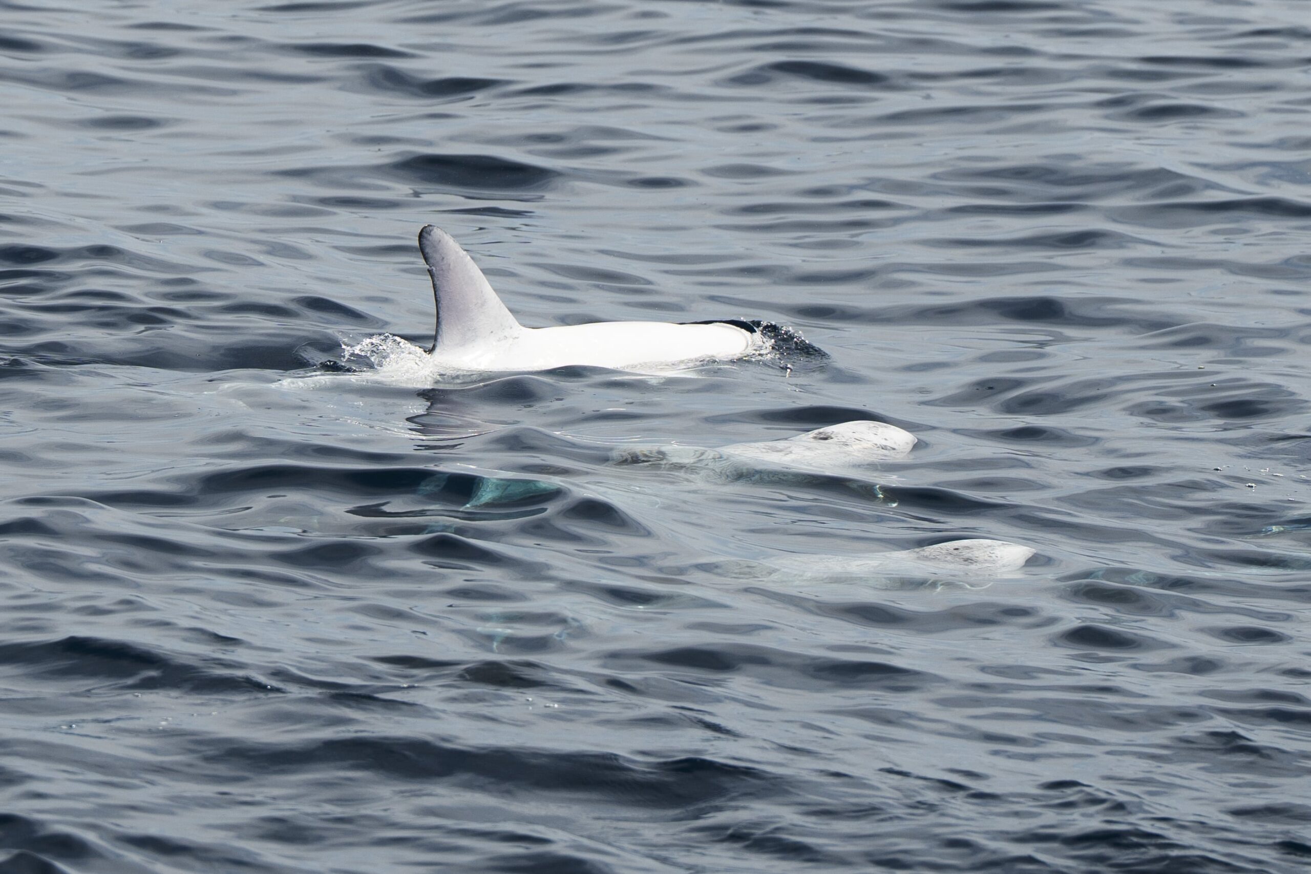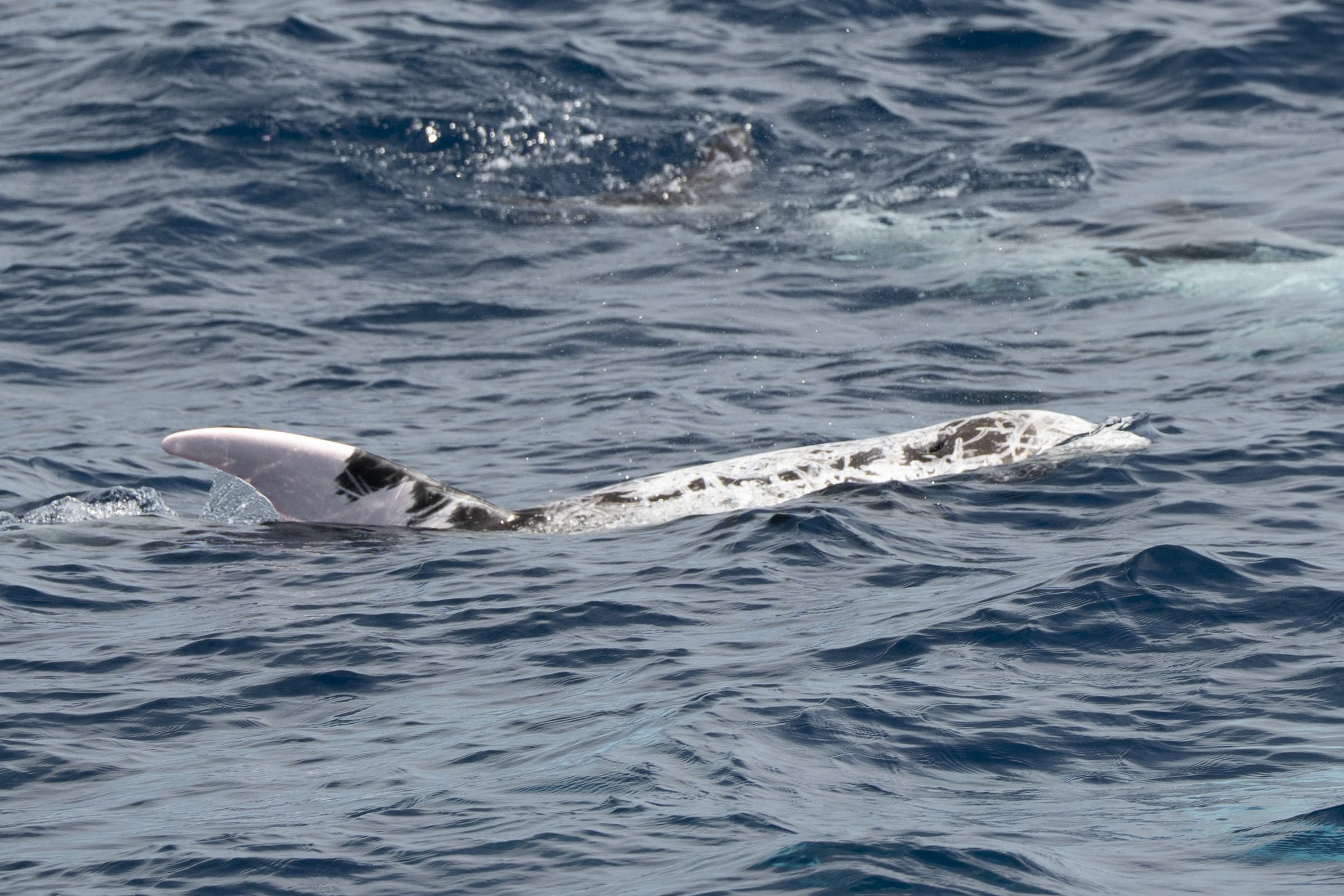 WITH THE RIZZ! And by that I mean Risso’s dolphins! It’s been forever since we’ve seen these incredible dolphins but we got lucky with the COOLEST pod today! These Risso’s were pretty close to shore and RACING after something when we found them but very quickly started logging at the surface in a close dense gathering. These pale colored dolphin give off a ghostly turquoise glow when drifting below the surface – and when and SECIAL ALL WHITE ONE shows up, they’re definitely our favorite friendly little ocean ghosts. It seems there’s some squid out there to hunt down as we found another active pod of bottlenose near by! The bottlenose swam right up to us surfing at the bow. We sighted a minke as well, it was doing minke things, swimming in zig zags but we got some good looks at it as it foraged for food.