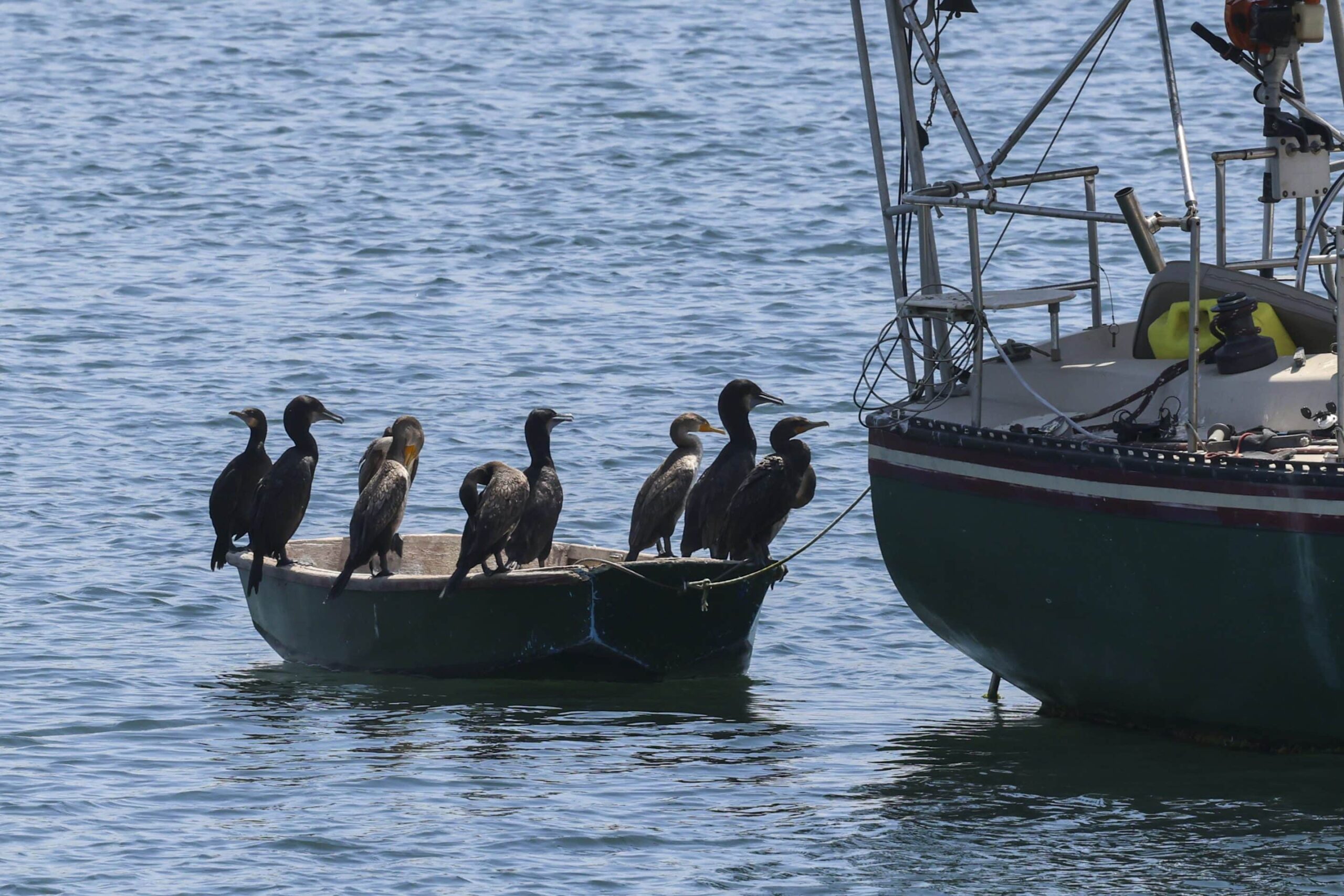 Our wildlife viewing began just a minute after we left the dock. Hundreds of birds and a dozen California sea lions, our feathered and flippered friends. We saw brown pelicans, snowy egrets, great egrets, Brandt’s cormorants, western gulls, Heermann’s gulls, and a great blue heron. Many of the birds were resting and maybe 25% of them were staring below through the slats to the live bait fish, kept in netted pens below. Now and then a quick jab and the bird is successful in having a sardine meal. Red-necked phalaropes were seen a couple of miles out of the Channel entrance. These are technically shorebirds that spin in circles at the surface and stab tiny copepods and other zooplankton, such as krill, for a meal.
