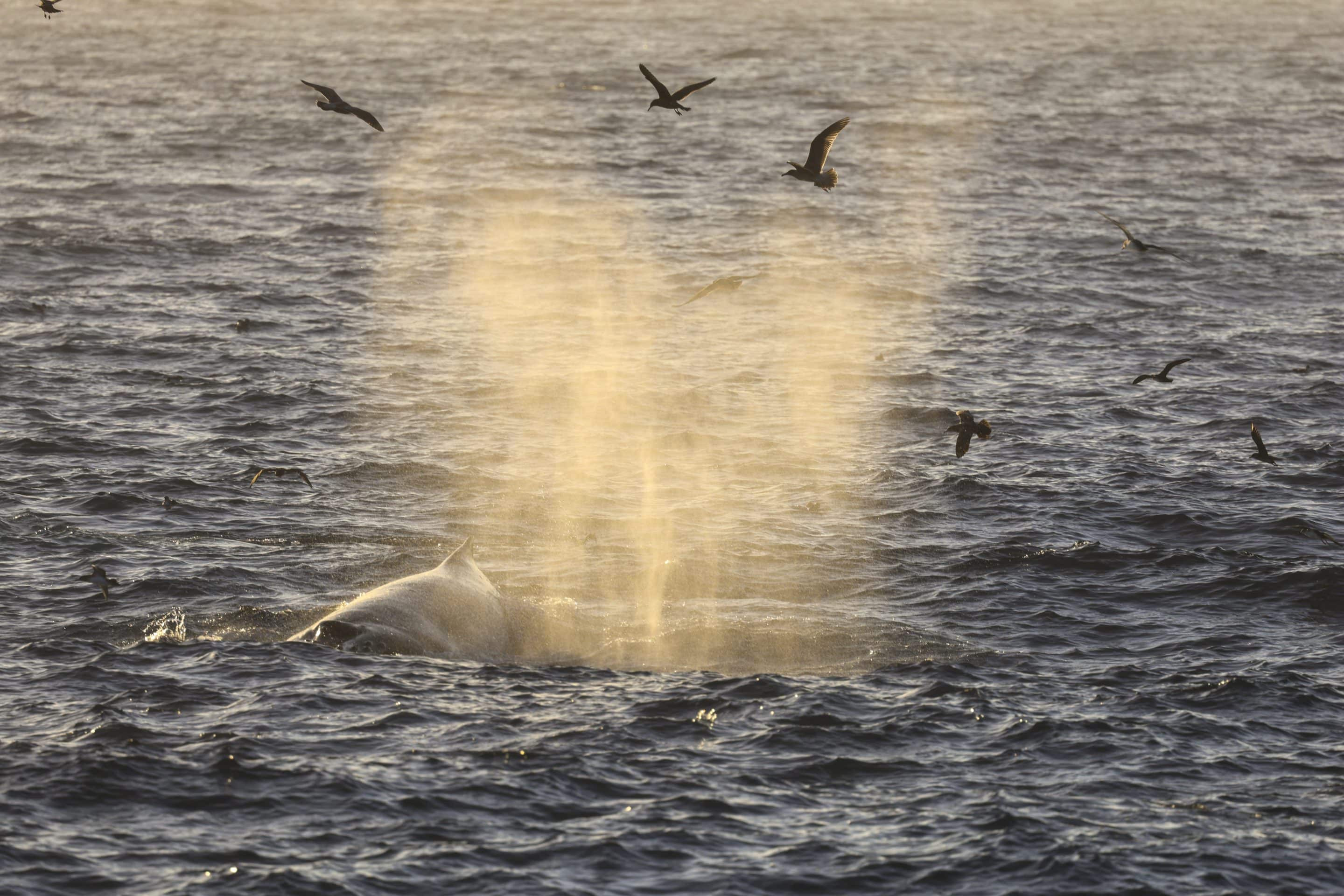 There were thousands of seabirds including the black-vented shearwaters, brown pelicans, Brandt’s cormorants, Heermann’s Gulls, Western gulls, Elegant terns and a couple of Pomarine Jaegars chasing the birds that just caught a fish. This was an all-you-can-eat ocean buffet table of epic size. The small schooling fish are the anchovies and sardines and others, becoming food for all of our feathered and flippered friends. We saw a few ambitious California sea lions feeding with the dolphins, likely locating the baitball of fish by the vocalizations of both the dolphins and whales, which are acoustic and find each other by the sounds they make. The human passengers made a lot of sounds as well. We hope that you had a great time and that you give us a follow on our social media and tell a friend or two about an enjoyable way to witness the fecundity of the mighty Pacific Ocean here in Southern California. —Naturalist Greg McCormack