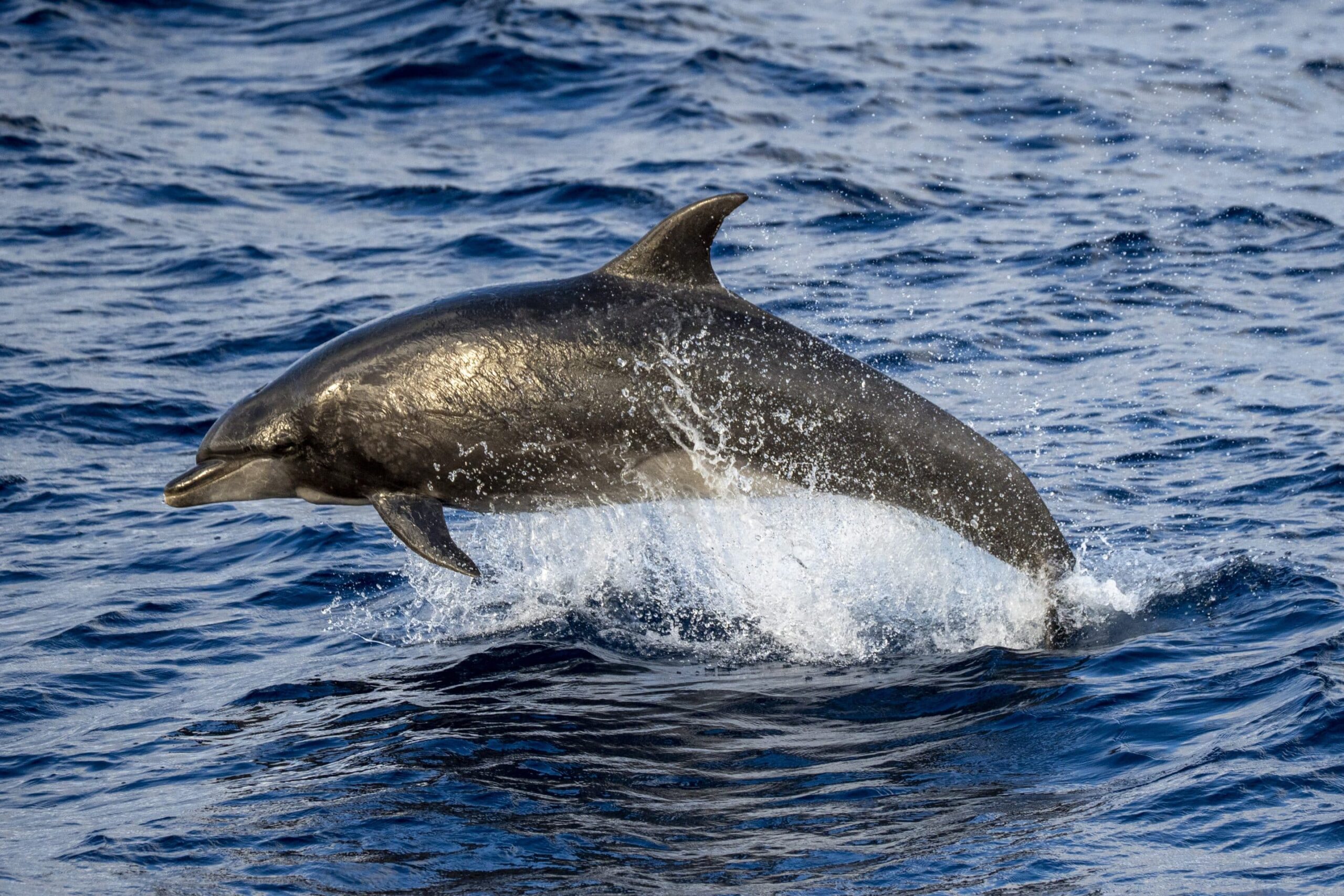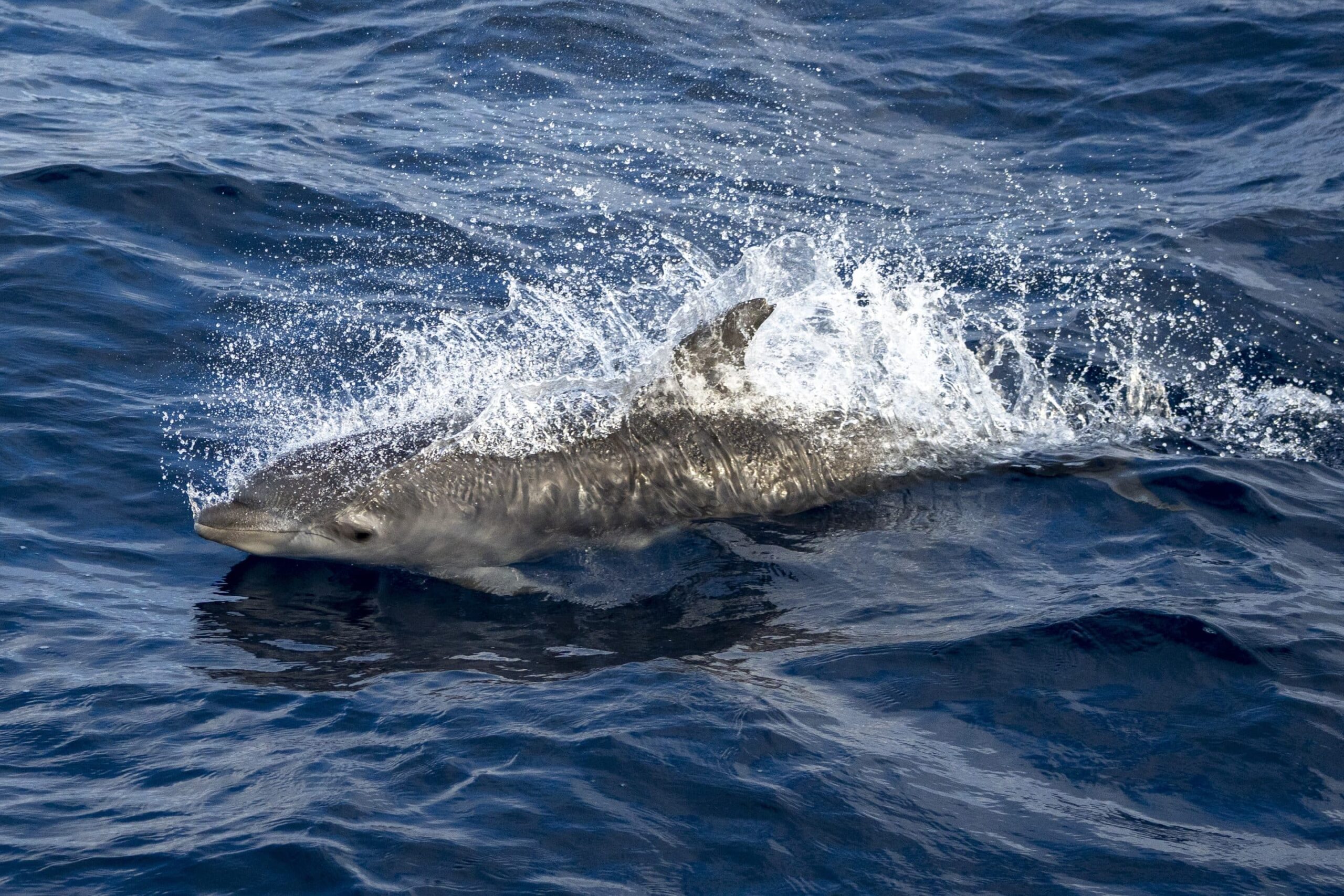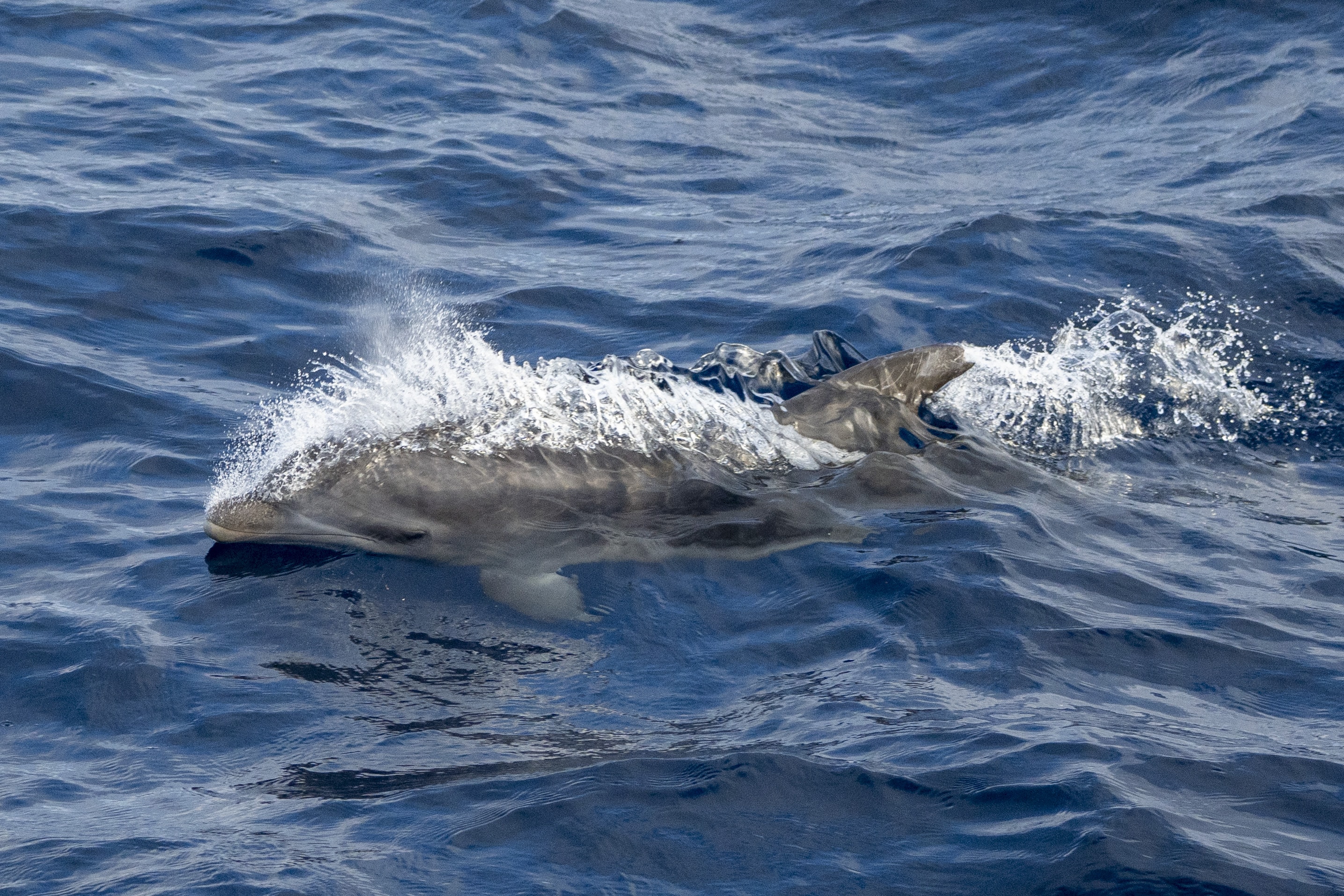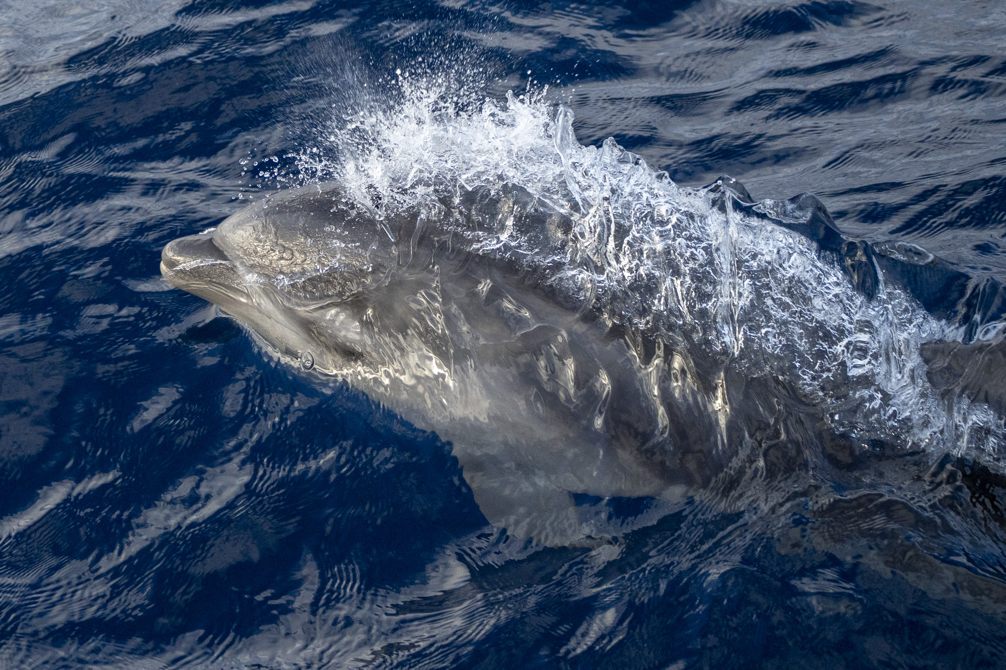 A STUNNING DAY on the ocean, we’ve got a short period swell rolling through but the weather was gorgeous, warm air, blue skies, clear water. We caught up with a MEGAPOD of long-beaked common dolphins that were breaking into stampede intermittently – the energy was intoxicating, you could almost feel their excitement on the boat! While we were with the commons, we sighted some strange splashes that almost looked like a spout, but when we headed over we found a pod of bottlenose dolphins, nearly 75 behaving very differently. They were a playful kind of mellow, surfing and socializing around the boat.