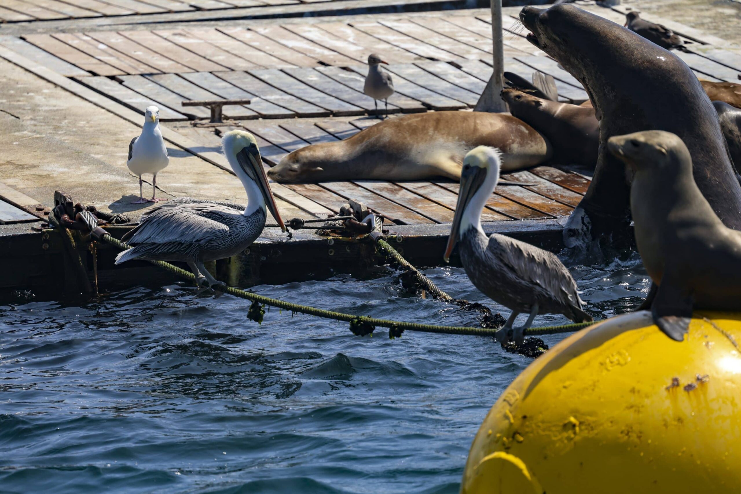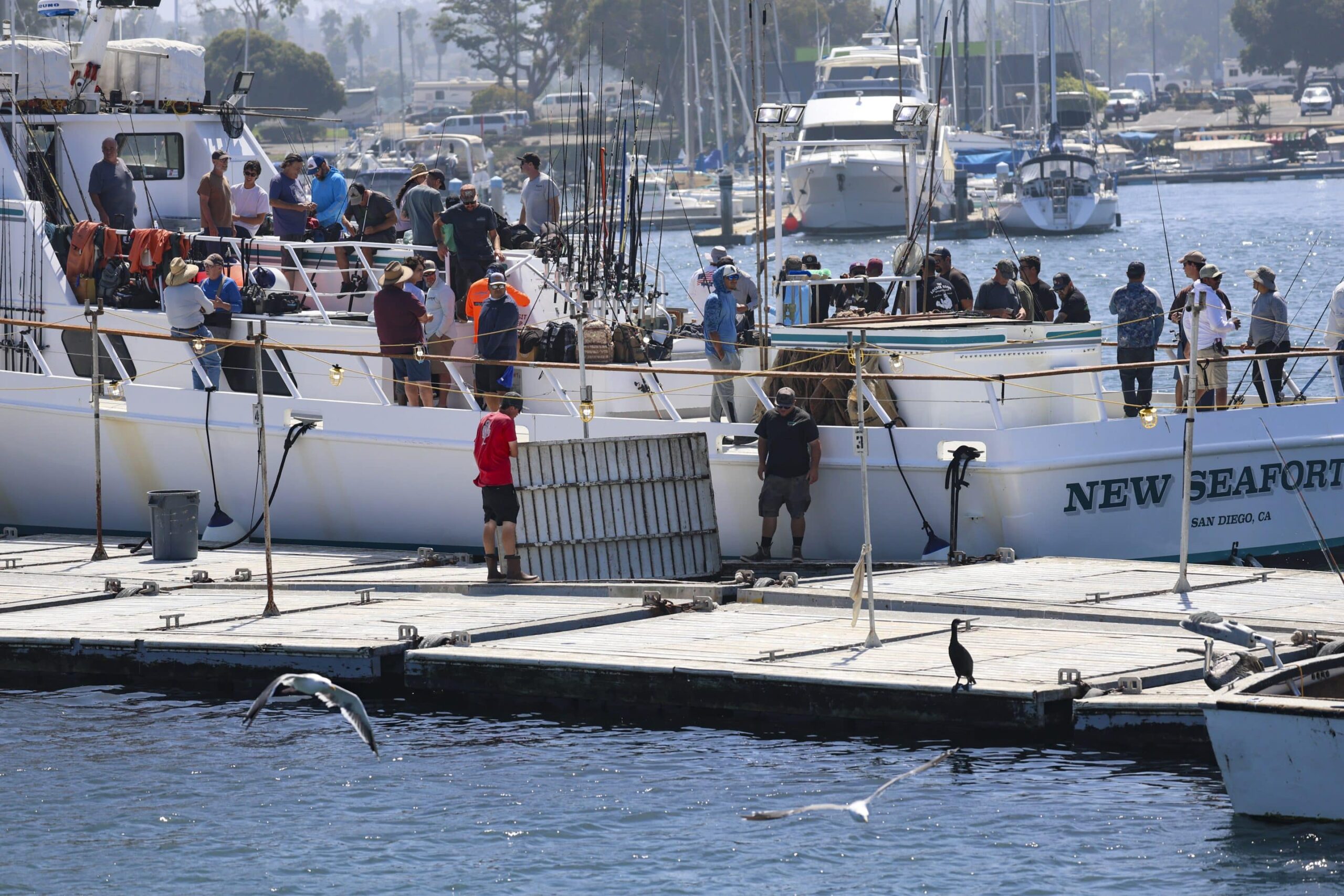 We had a bit of hazey smoke at the beginning of our trip. Austin, our deckhand and one of our captains, said he saw a brush fire beneath Interstate 5 and 805 just a few miles away on his commute to work. We enjoyed the barking and antics of the California sea lions at the floating bait dock, our flippered friends, and then we had pelicans, gulls, cormorants and egrets, our feathered friends, being dispersed by two fishing vessels, but a few intrepid, persistent Great egrets obtained some of the unsuspecting fish swimming around in the netted bait pens below the wooden slats.
