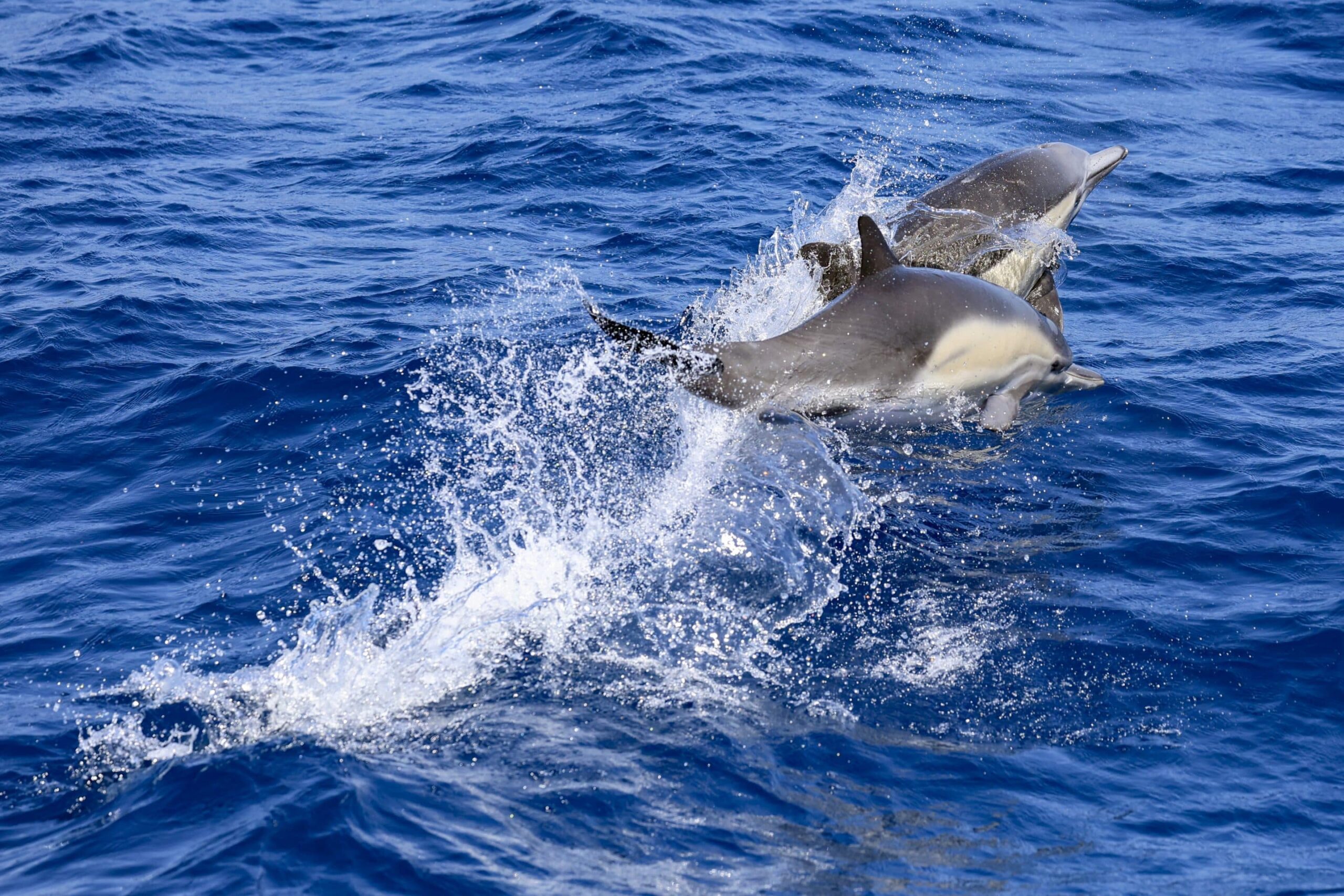 Over the Nine-Mile Bank in 2000’ of water, we found about 500 Long-beaked common dolphins (LBCD’s) that showed us their strength, power, grace and beauty as they expertly maneuvered to jostle into position to get a “free-ride” off of our bow and surf our wake. We continued toward the northwest and found another pod of LBCD’s that took time out of foraging and courtship behavior displays to come play with our boat, the M/V Privateer. We enjoyed seeing some nursery pods of cow-calf pairs and the antics of the breeding adults porpoising and racing off in formation, a type of showing-off and dominance hierarchy and competition for getting attention from other dolphins in the super-pod. Helicopters and small navy vessels were seen, along with numerous pleasure boats off of the coast of San Diego, “America’s Finest City.” —Biologist Greg McCormack