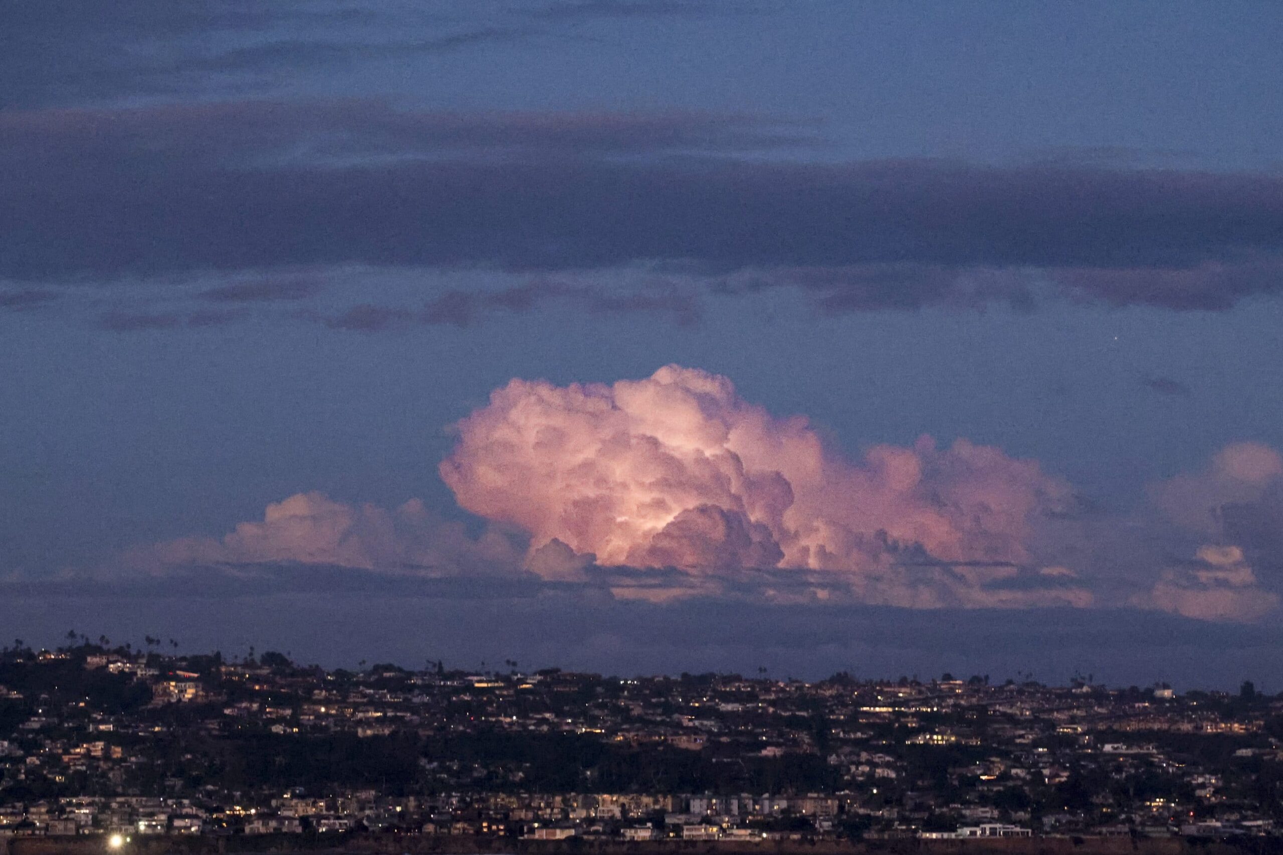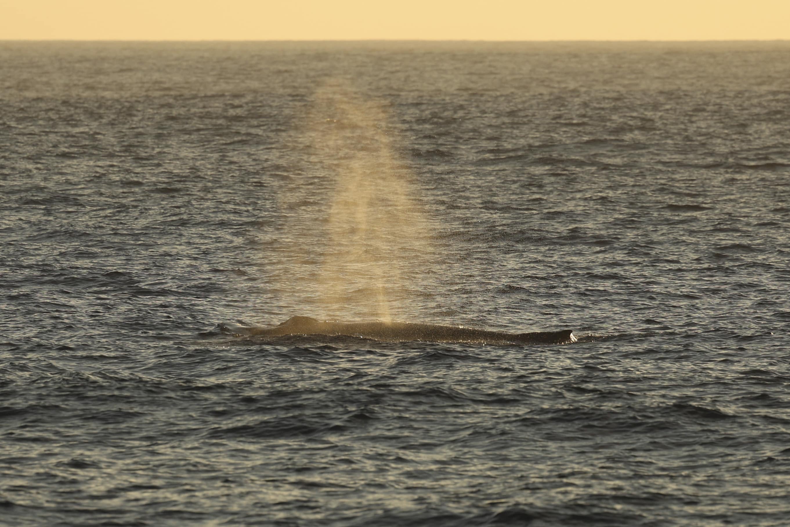 On our sunset trip, we raced up to the La Jolla canyon once again! The seas were very quiet on the way up, but sure enough as soon as we got to the canyon we observed a MEGA pod of Long-beaked Common dolphins. They were everywhere we looked! We got amazing looks at calves leaping out of the water as many of the dolphins surfed beside us in our wake. We were about to leave for home when we spotted a spout to the north. We cruised up and stopped to wait for the next sign of the whales. All of sudden the passengers squealed with joy when one Humpback popped up behind us only 50-yds away! Then the other surfaced to our 7 o’clock! We were stoked as they were swimming toward us! We were lucky to see both whales lift their flukes as they went down for their sounding dive. We got one more look as they simultaneously spouted in the setting sun! Their spouts were golden! We waved goodbye and enjoyed the stunning sunset and even a lighting show in some big billowy thunder clouds!