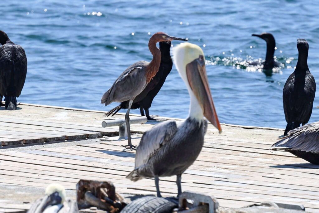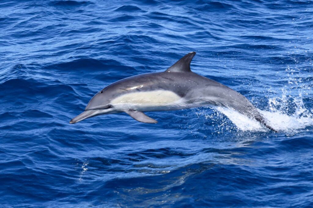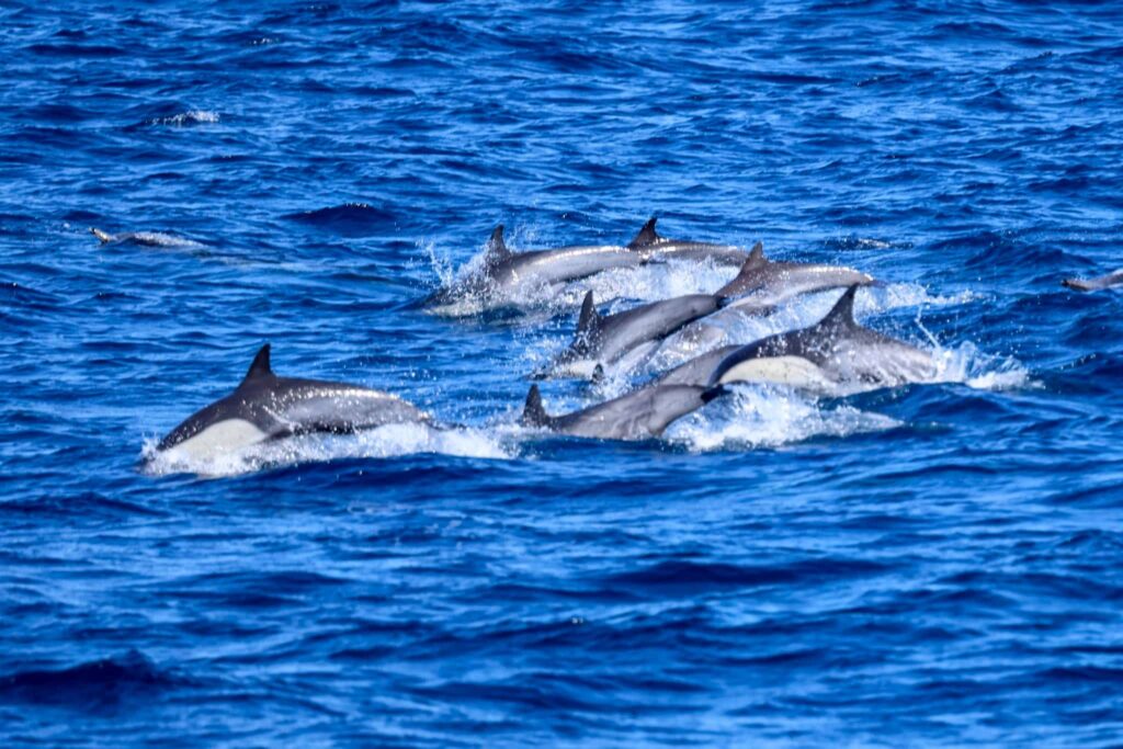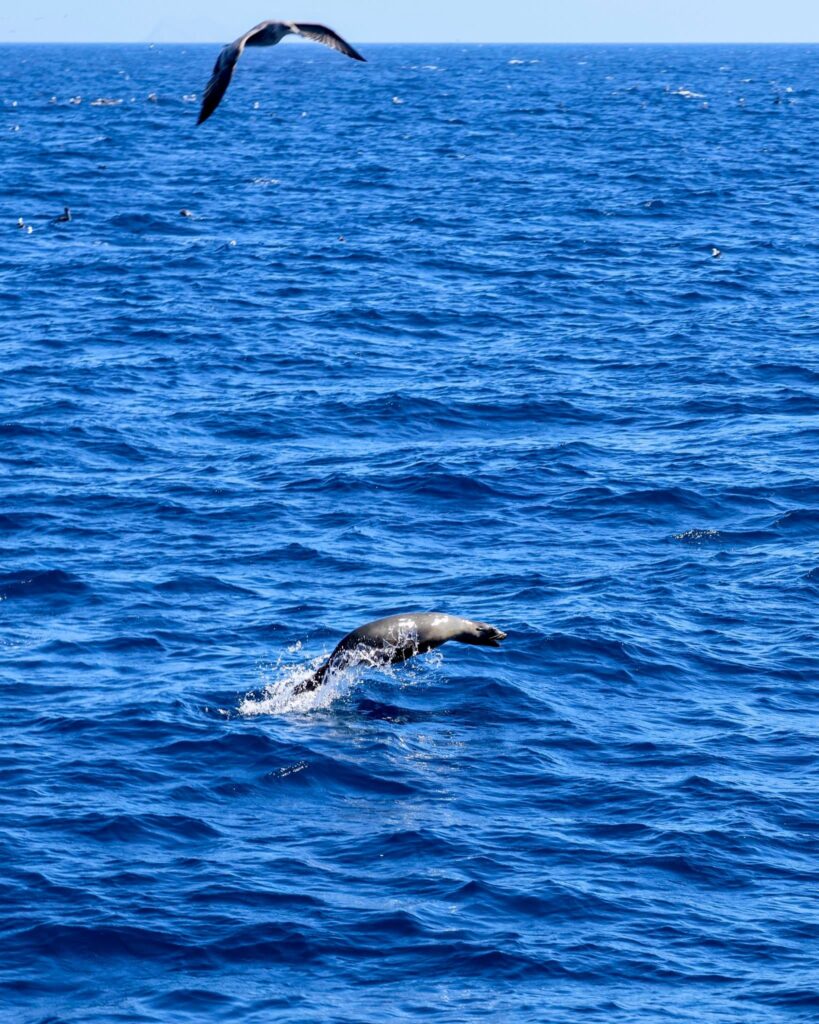 Another beautiful day in the books! We had a fun time cruising out to deeper water! We headed to the 9-mile bank and spotted a bunch of birds diving in the water. We found a huge aggregation of birds with terns, gulls, shearwaters, and California brown pelicans! We spotted a big splash which alerted us to a huge pod of ~400 Long-beaked Common dolphins! They were traveling to the NW and enjoyed watching them surfing in our wake and at the bow! We were completely surrounded by an amazing explosion of wildlife. It was pretty quiet on the water until we got out to that zone so it was exhilarating to find everything there in one spot!