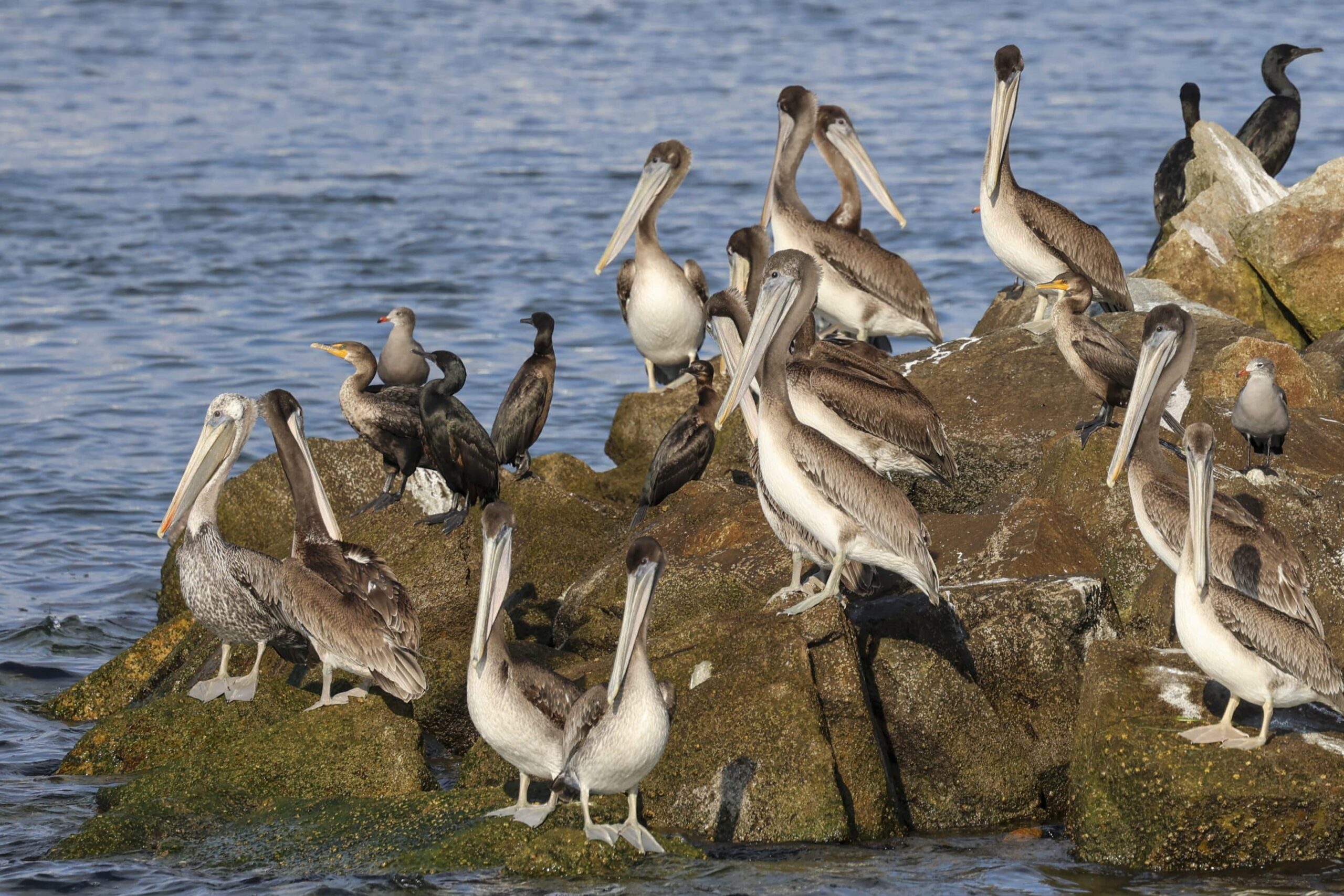 We made it to the Nine-Mile Bank and beyond to border waters and spotted two pods of Long-beaked common dolphins with enormous pods and many thousands of seabirds in Mexican waters to the south. It helped having a flock of brown pelicans plunge diving in the distance to mark where all the dolphins were porpoising. We saw many hundreds of the black-vented shearwaters seeming to materialize as they surfaced amongst the hungry dolphins. The dolphins were changing direction often, darting to and fro to capture their next meal.
