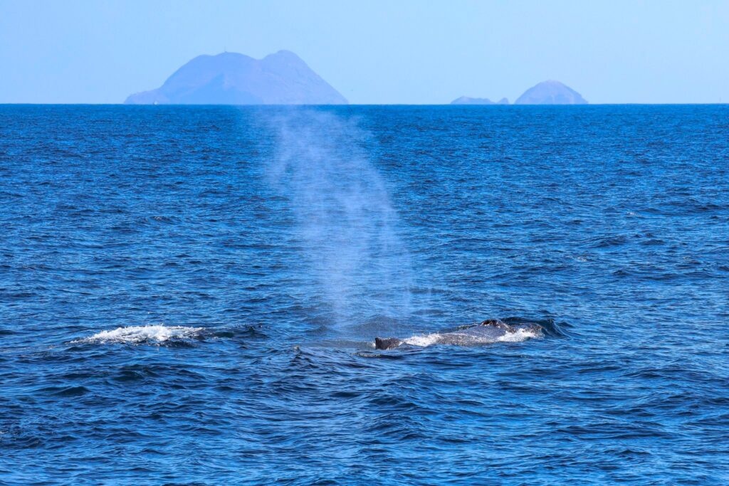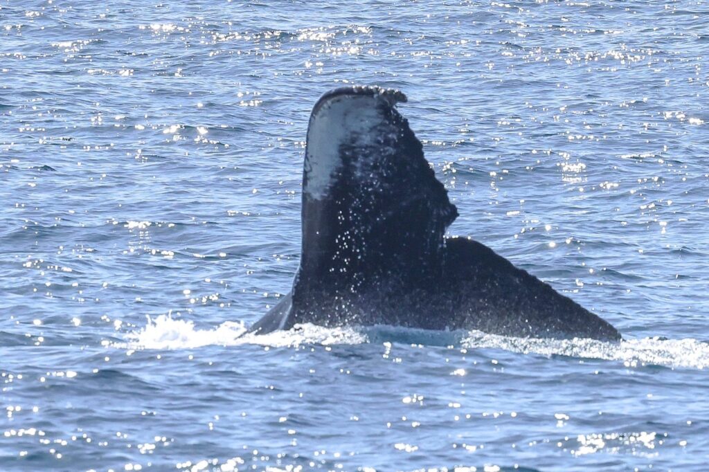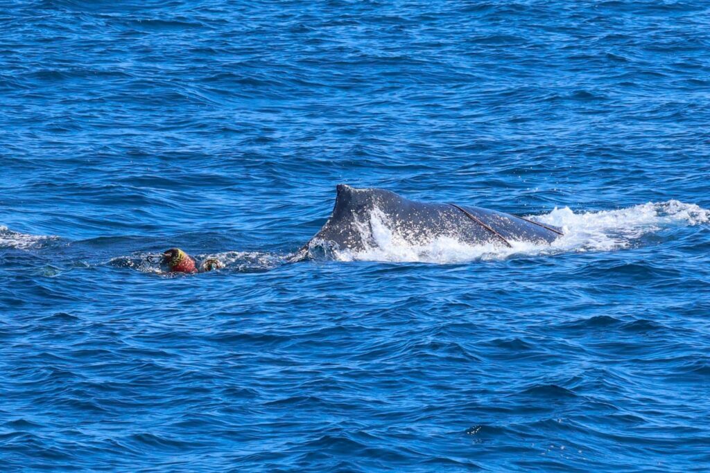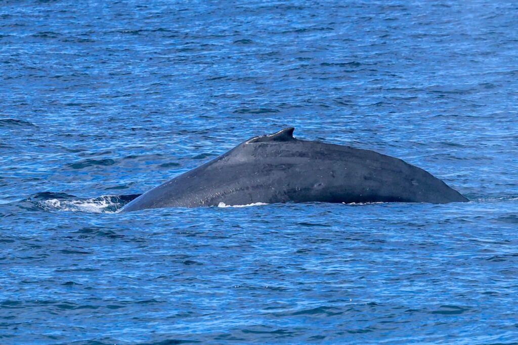 Now, Captain Brian went toward the haystack-shaped Coronado Islands of northern Baja California, Mexico. There we found three humpback whales swimming south. We got great looks. Unfortunately, one of them was entangled in fishing gear. Thankfully, someone had called this in earlier and a vessel from Sea World came out to investigate. We have one more trip this week-end, the sunset trip! —Naturalist Greg McCormack