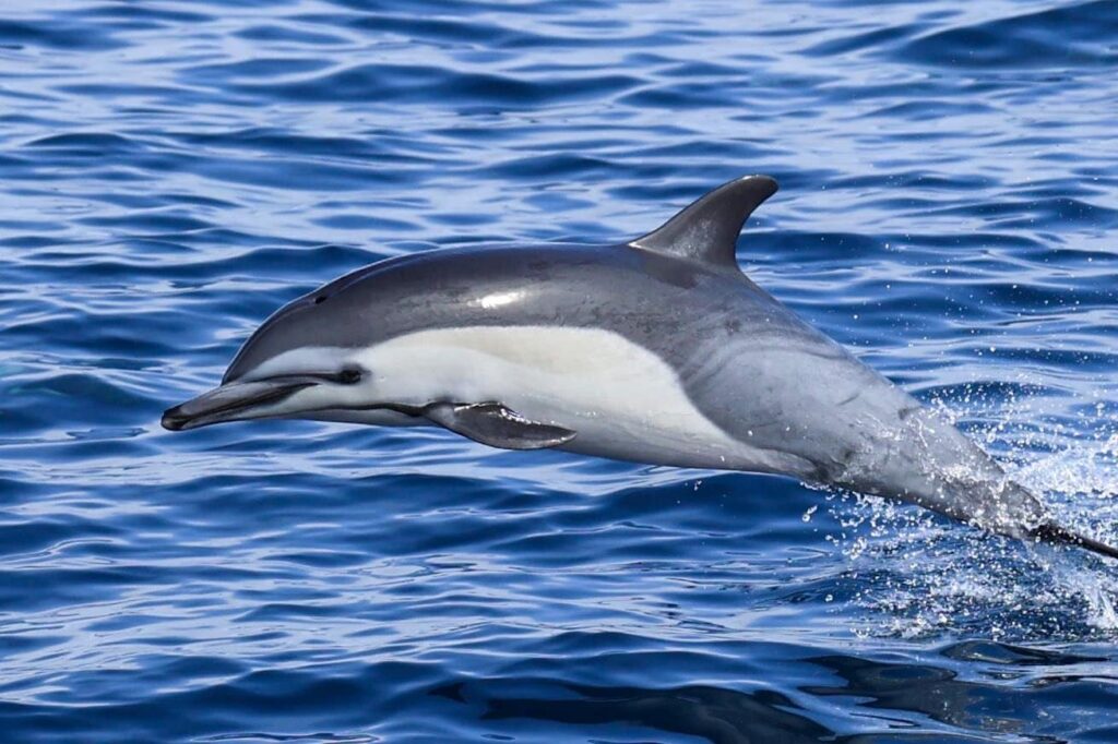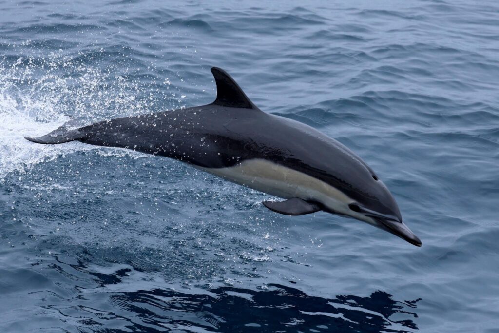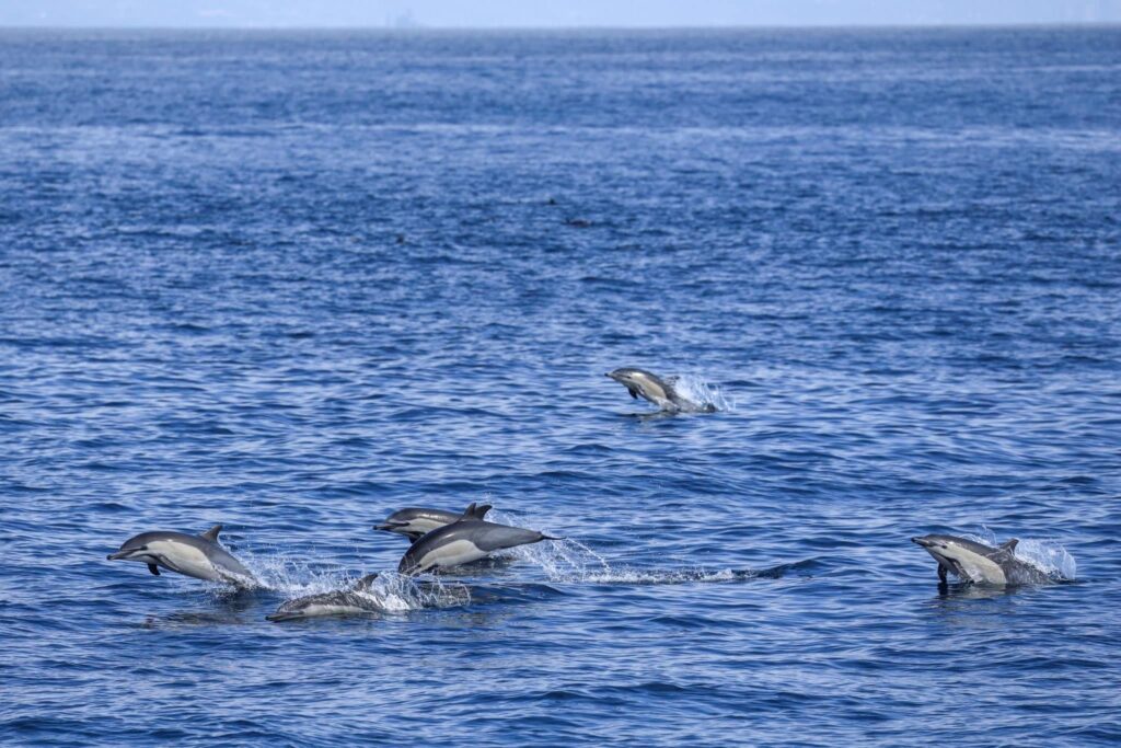 We cruised out to the west and our first fun surprise sighting was a raft of ~15 California sea lions! They were in travel mode heading north in about 300-ft of water. We continued and found an even larger raft of ~30 California sea lions! They were swimming fast, but we got some fun looks as they hung out beside us for a moment. They popped up their heads to check us out before diving into the sea. We also spotted a small pod of ~100 Long-beaked Common dolphins that were heading north in gorgeous glassy water! We could see them dive down close to 20-ft below us! We continued on and beyond the drop-off we caught up with a super energetic pod of ~300 Short-beaked Common dolphins! We spotted their big splashes and they breached and porpoised about. We were cruising by and the select energetic ones raced over to us to ride the bow and surf in our wake! They were showing off for our amazing passengers who were elated to see them! Our next stop was the 9-mile bank and while just enjoying the views of the Coronado islands, a Fin whale surfaced from a dive pretty close to us! We got just a couple of views before it dove down after 4 breaths. It was a champion diver as it stayed down for 14minutes! We saw it again to the SW of us and watched it travel to the south. It went for another dive after 5 breaths and arched its back for another sounding dive. The next surfacing was way south about a mile away! We waved goodbye and enjoyed more Common dolphins on our way in!