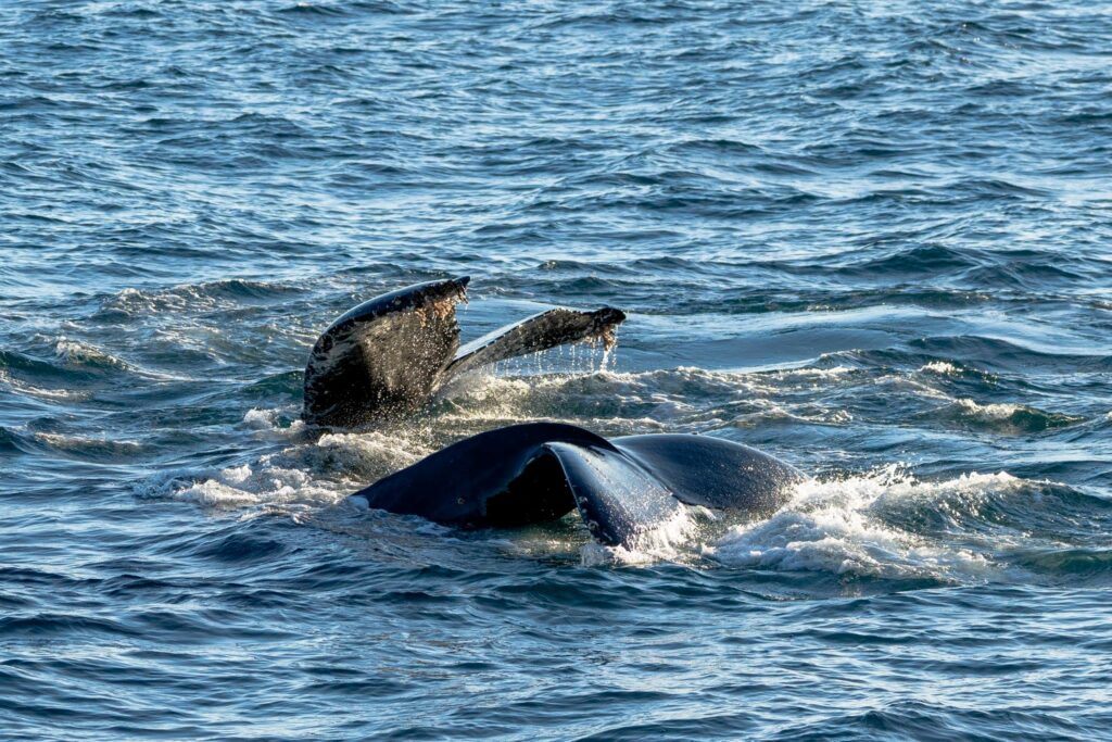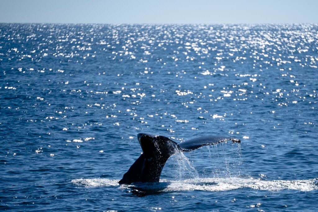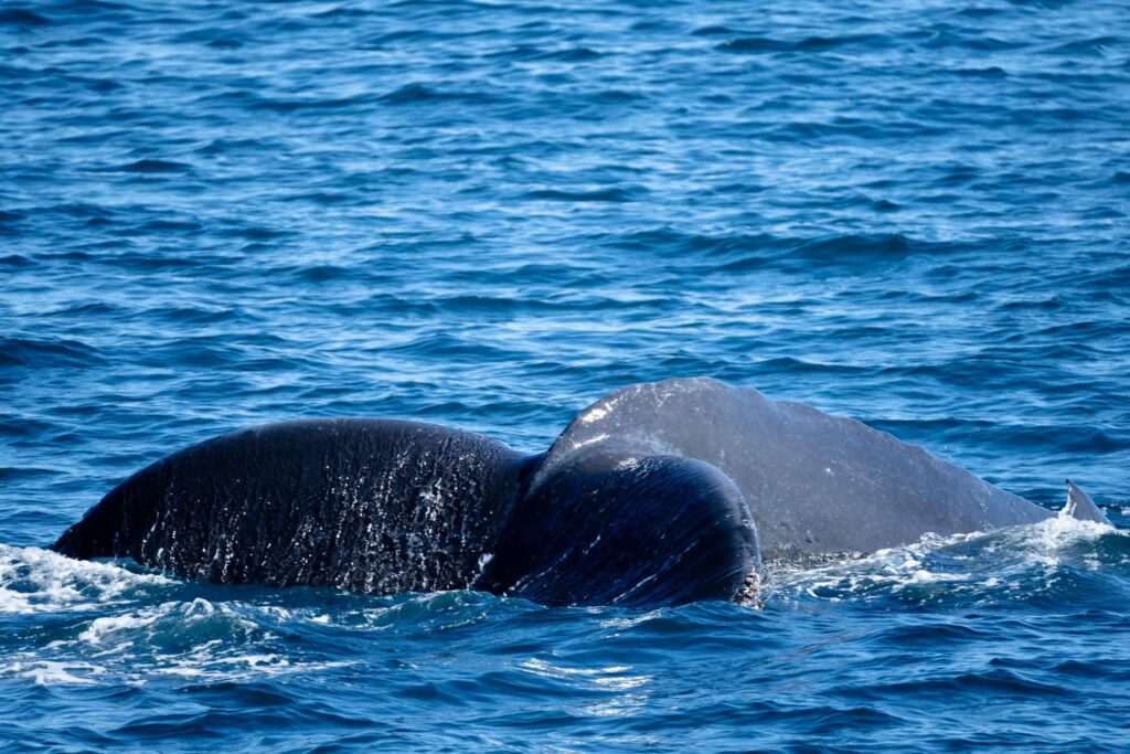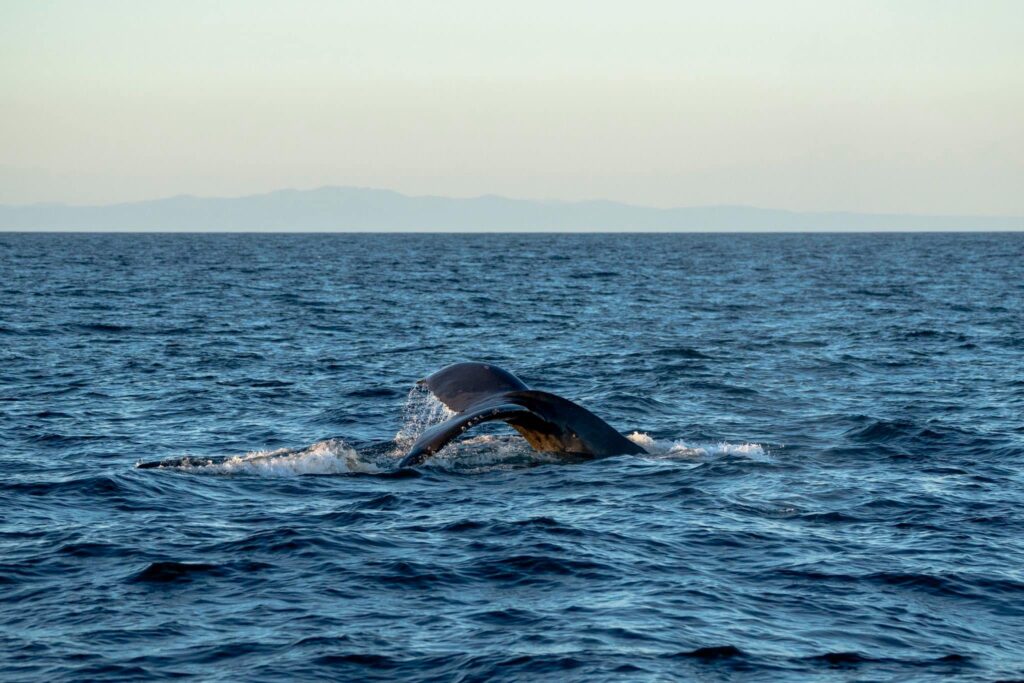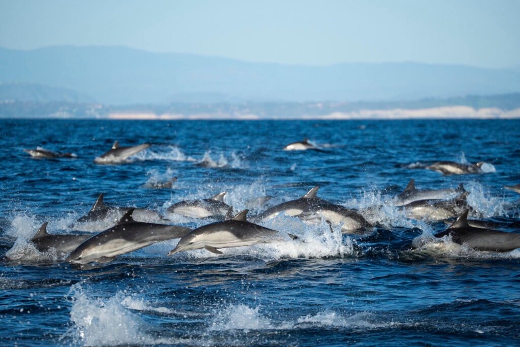 Our afternoon trip started off slow, we took quite some time searing to locate a very sleepy slow moving humpback whale. We got great looks as it logged at the surface slowly. The ERRUPTION of life kicked in just a couple hours later on our sunset tour. We got to the drop and found HUNDREDS of stampeding long-beaked common dolphins – this wild amount of biomass is beyond thrilling, imagine rolling up on a band of wild horses and being invited to join the stampede. Kinda like that, but – hundreds of wild dolphins, encouraging you to join in on all their fun. While we were with these dolphins, we managed to find 5 HUMPBACKS! There were tons of time to hang out with these humpbacks as they rolled around playfully with each other steadily cruising south. We saw some funky dive, sassy tail flicks and some flirtatious behavior in the group.