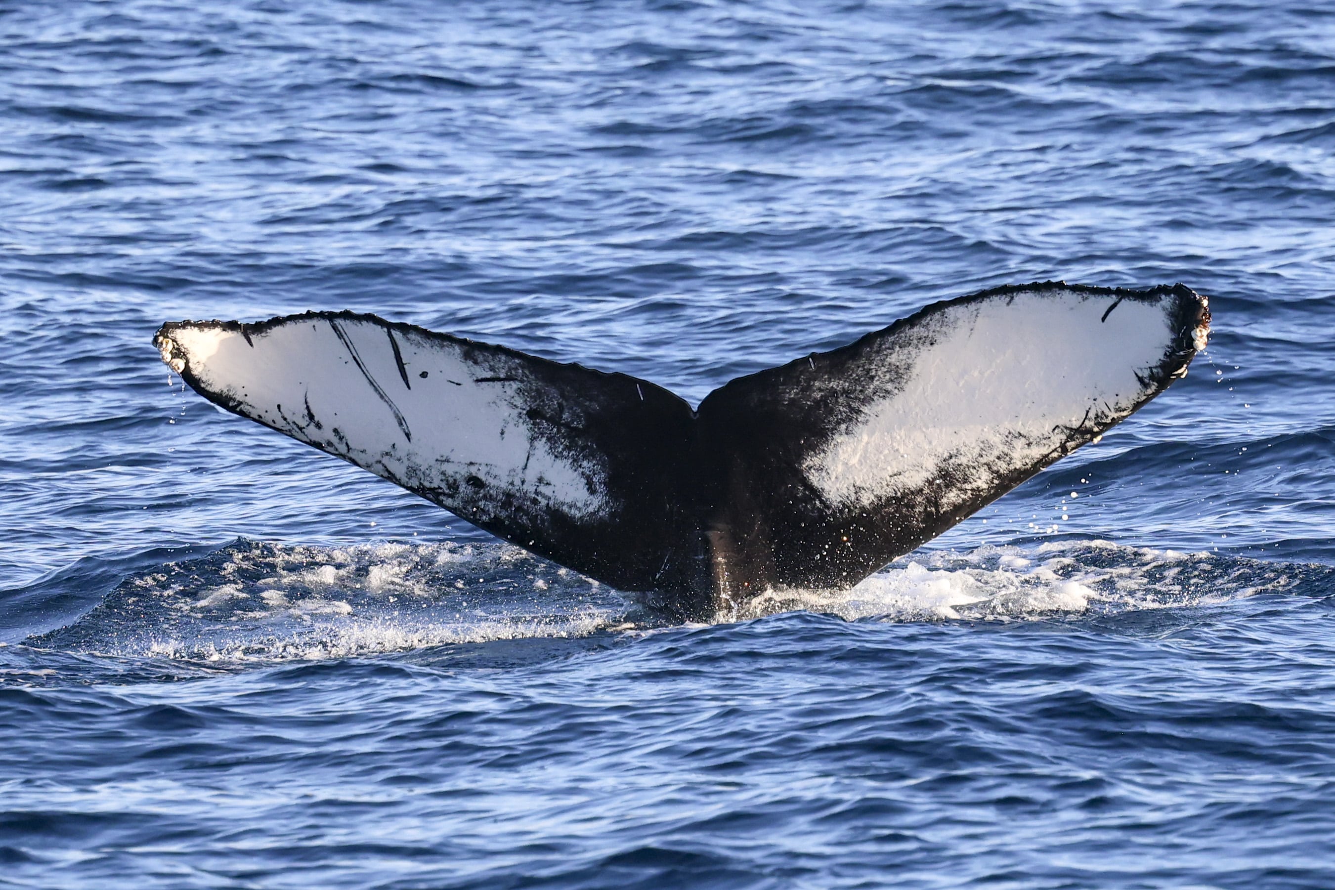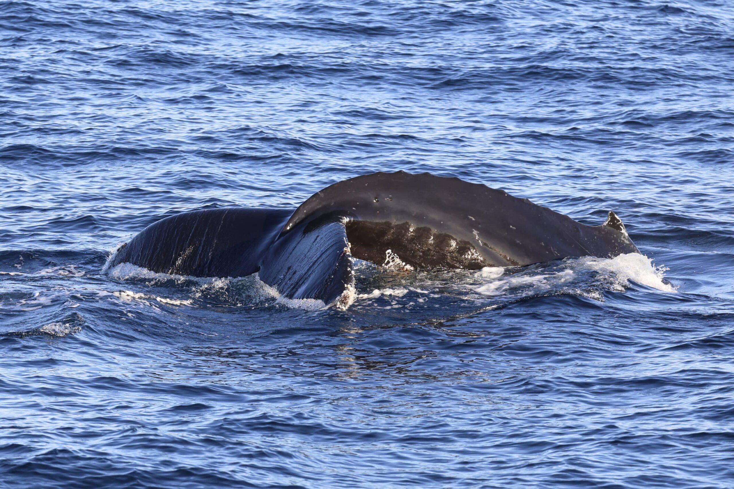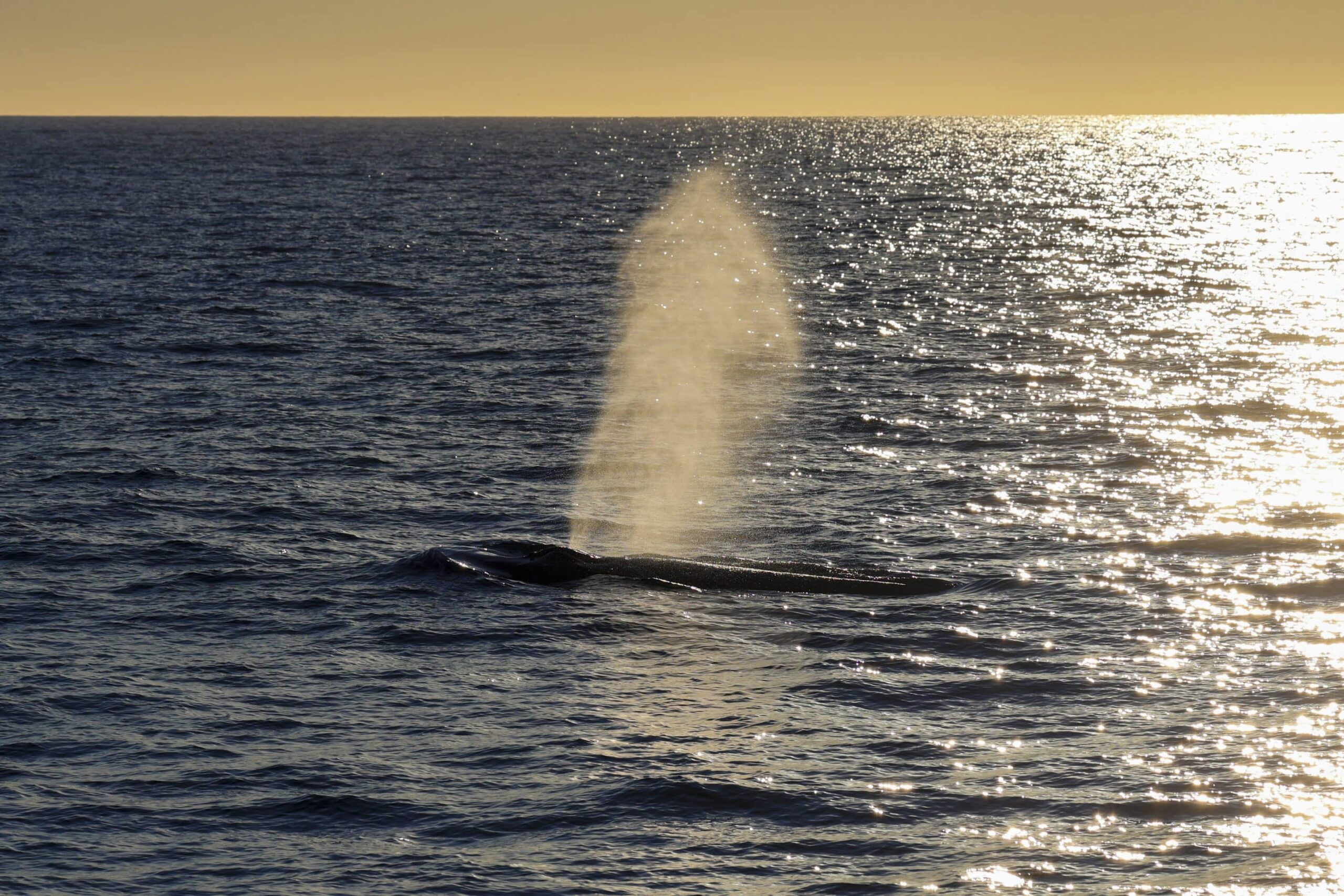 We enjoyed a beautiful sunset trip that was nice and smooth with amazing visibility. We could actually see out to San Clemente, which is approx. 60-miles away. We cruised out to the west and spotted a huge spout to the west of us. It would spout once every 1-2 minutes. It kept cruising out to the west further from us. We spotted a Guadalupe fur seal jug handling at the surface! We were searching for it when a passenger spotted another spout to the SW of us. We waited but never saw them again but lucked out as we sighted a Humpback headed south! It came up for 3-4 breaths with a short 3-5min dive. We had great looks as it lifted its flukes every time! We were also fortunate to see a rainblow! The sunset was absolutely stunning! Even way after the sun went down we enjoyed the golden orange glow on the horizon!