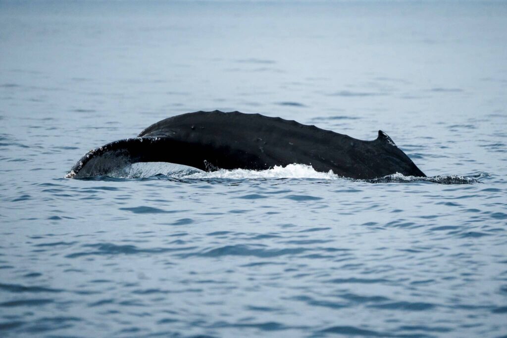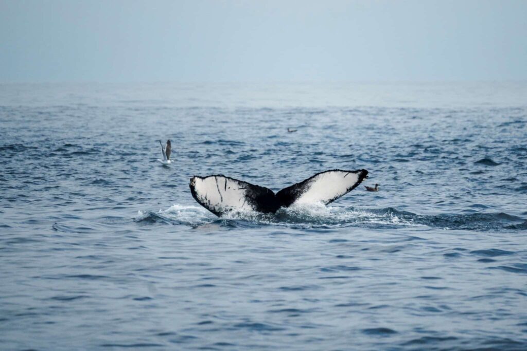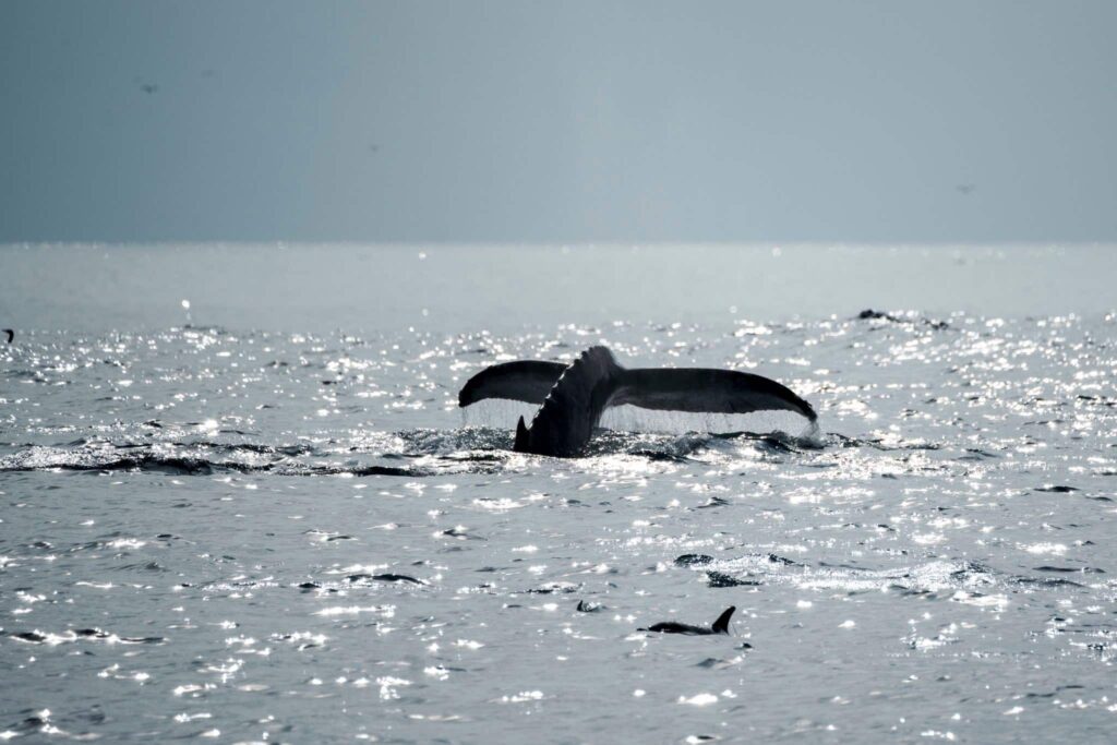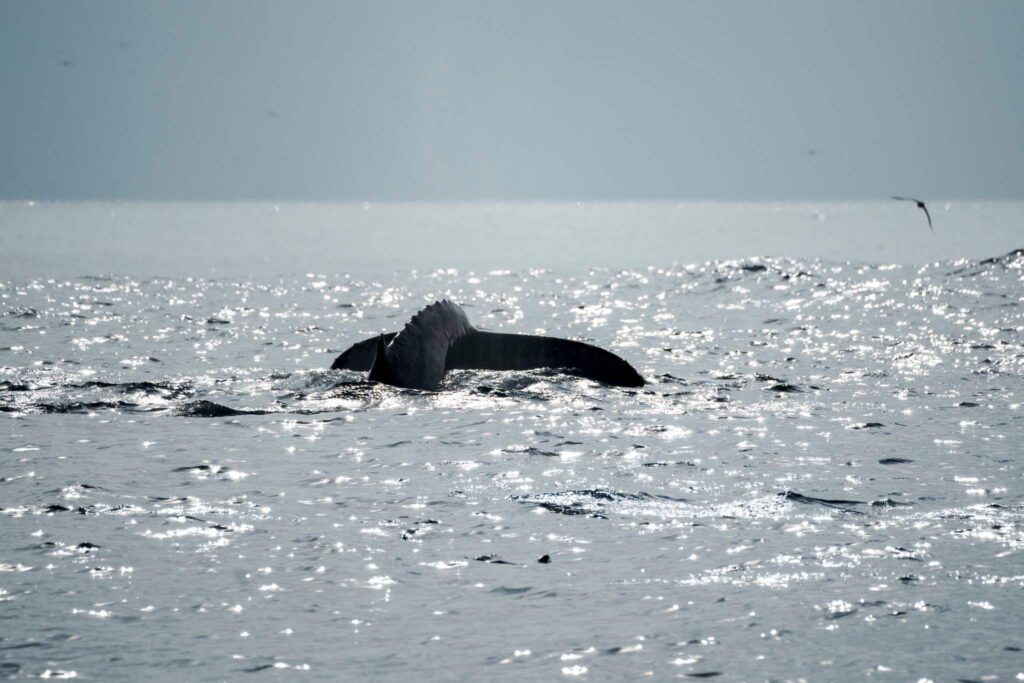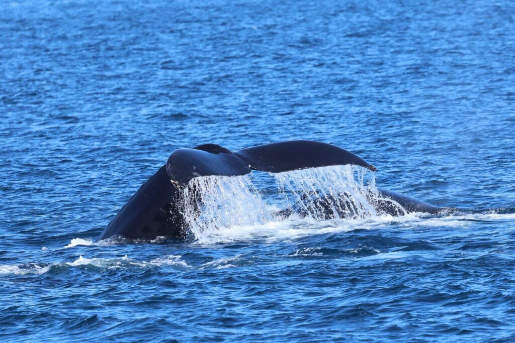 What an incredible streak of luck! Or maybe WE’RE IN FOR A GOOD FALL!!!!! We’ve had humpbacks every single day for the last week or more! Sometimes up to 7 in a trip! This evening we had a huge feeding frenzy going off right about at the drop off. Hundreds of dolphins at play with a humpback whale from our earlier trip! There were thousands of birds in the sky waiting for the opportunity to dive in and chow down on the bait concentrated in our waters.
