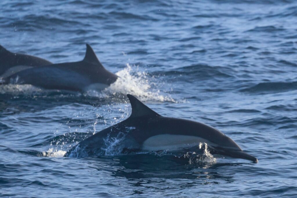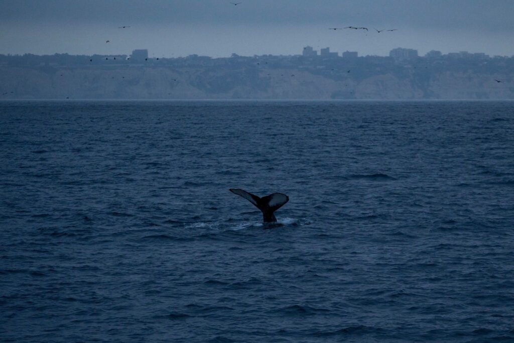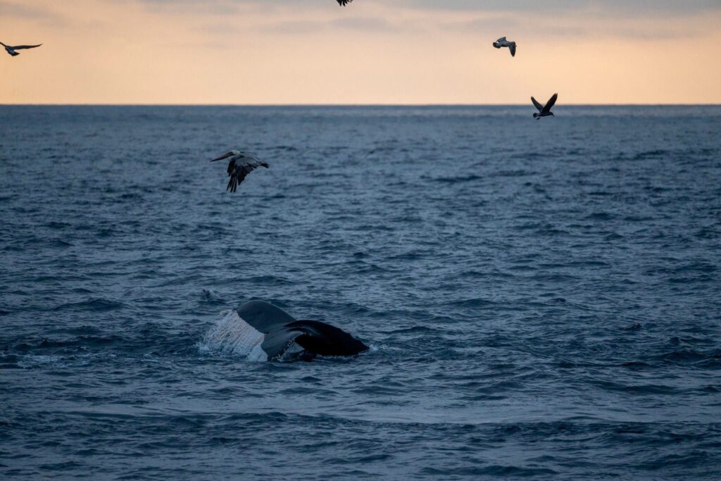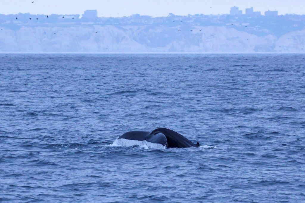 We journeyed far to the west and then headed north west. After a long search, we were able to find a large flock of birds flying erratically on the horizon 3 miles away. As we motored closer, we could see the splashes from dolphins. “There she blows!” Sure enough, we had a spout from a humpback, one of 14 species of baleen whale. There was a large bait ball of forage fish, producing an “all you can eat ocean buffet table” found about 8-miles off of Black’s beach and La Jolla Shores. After some great looks at the humpback and dolphins, we had to turn-around a voyage of 12 miles from the jetties.