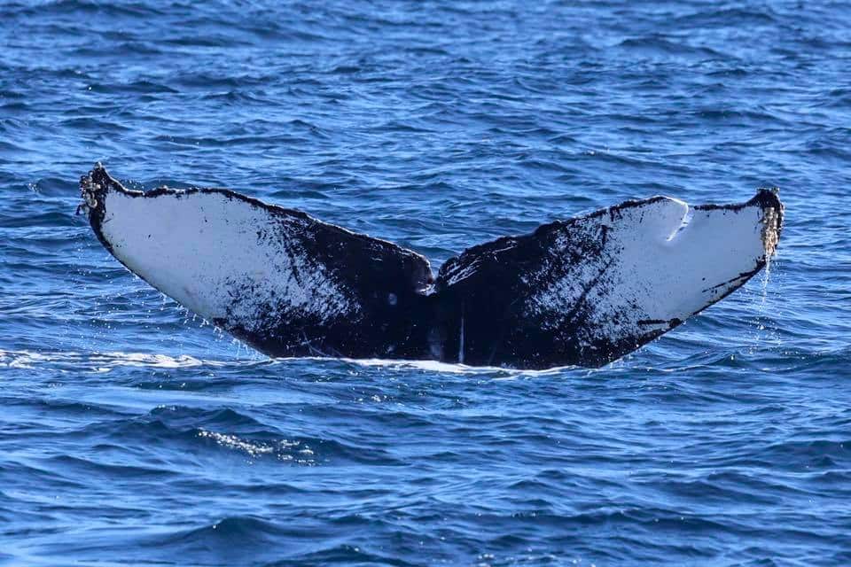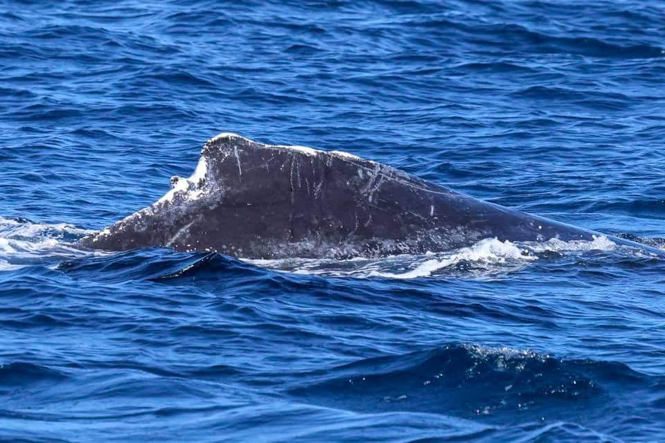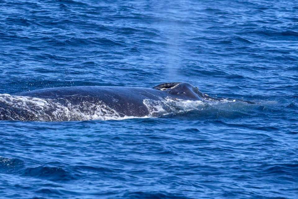 Today, on our afternoon trip, we explored out to the west and once we got to the drop-off we noticed diving birds and splashes on the horizon! We were on our way to investigate when a spout appeared only a mile away from us! It was a very sleepy, Humpback that was traveling south. It stayed down for 10-12 minute dive times but also came up for 7-10 breaths! It lifted its flukes high and we got great looks at its unique flukes! It had a cut in the right fluke and looked to be a bit scruffed up! We waved goodbye and continued out to the amazing dolphin pod that was super playful! There were some high flying show-off dolphins that played all around our boat! We spotted a Minke whale that swam toward the dolphins and then all of a sudden they took off into stampede mode! We got a couple more looks before turning home and enjoying the smooth ride!