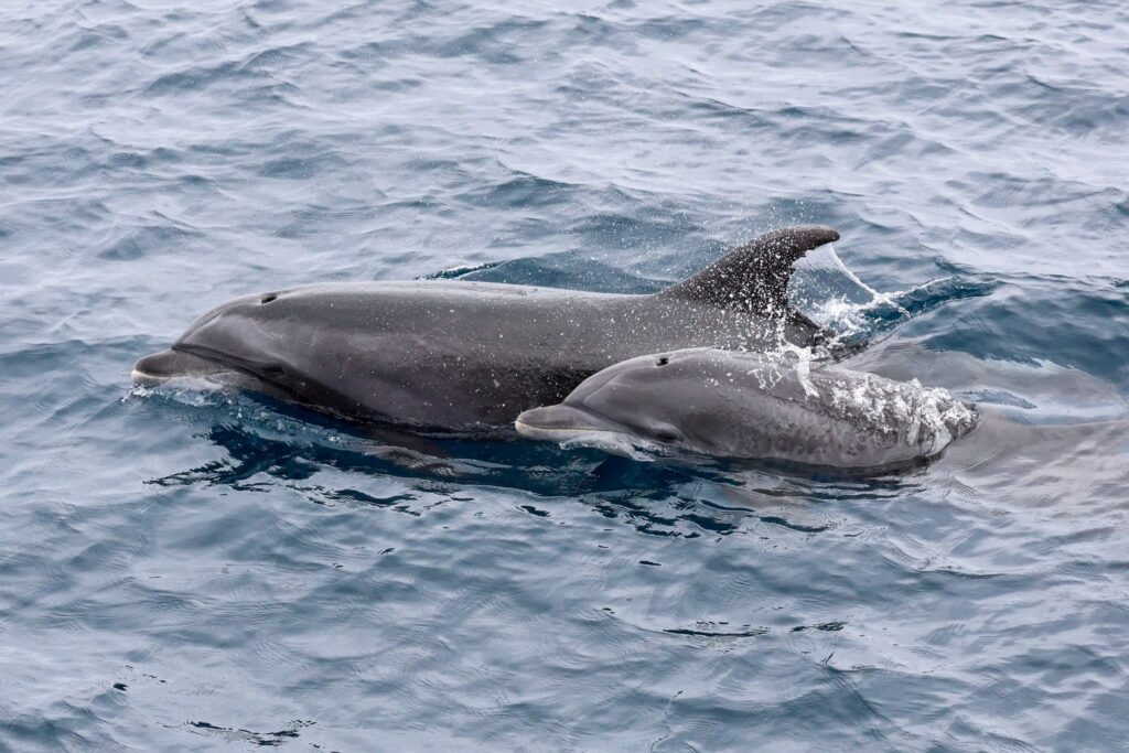 We found a pod of about 30 Offshore bottlenose dolphins. They are powerful swimmers and are one of the larger members of the dolphin family. They are the archetype, meaning they represent the dolphin family with the conspicuous falcate or curved, crescent-shaped dorsal fin. They have the bottlenose shaped proboscis or beak and inside the mouth are the cone-shaped, pointy teeth. Porpoises have flatter, spade-shaped teeth, triangular dorsal fins, are generally smaller and less social than the dolphins and belong in a different family.