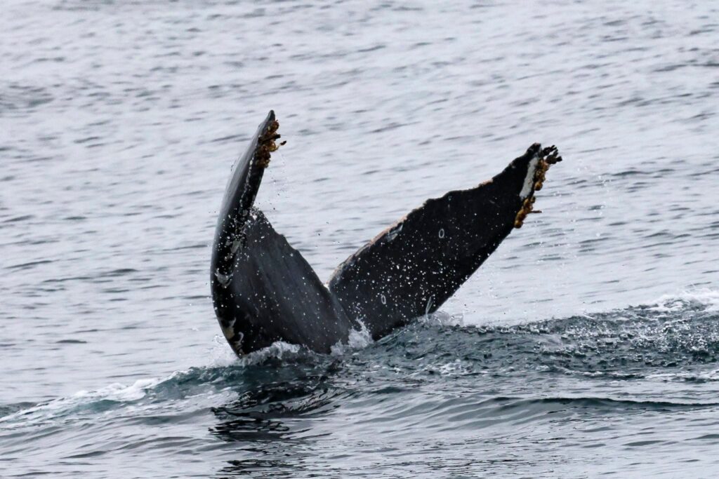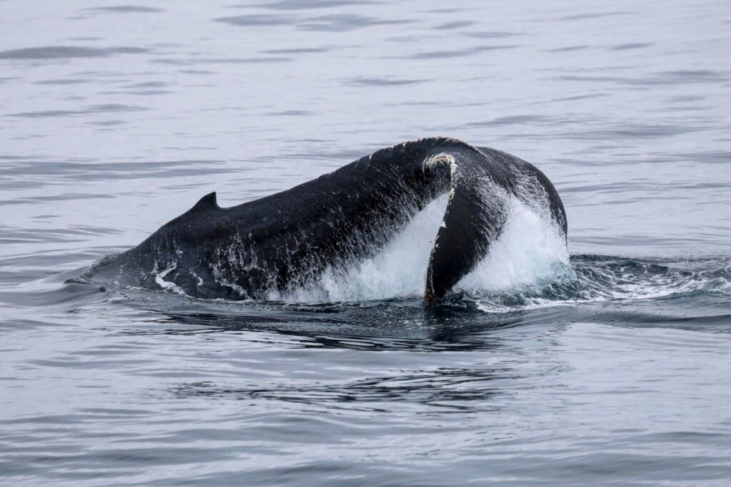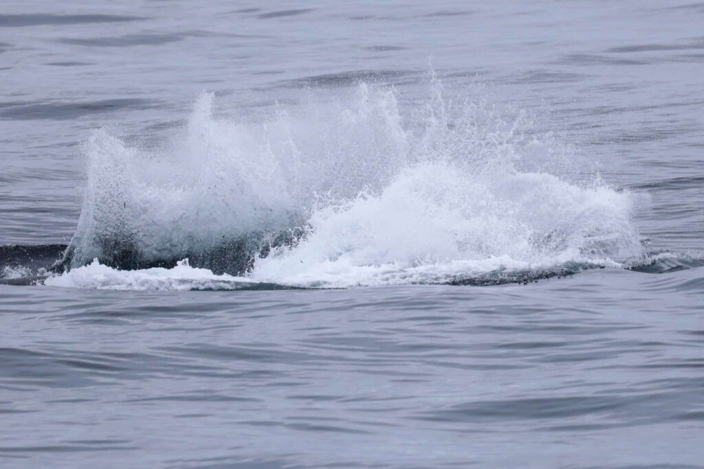 Just 2 nautical miles beyond the north and south jetties, we had a migrating humpback whale heading south toward Mexico. It looked like a 2-year old sub-adult, a bit emaciated with floppy flukes shown on its short duration dives. It exhibited some cool behaviors, such as tail throws and lob-tailing. We did lose over 7000 North Pacific humpback whales during the last big marine heat wave. SST or sea surface temperatures increased dramatically by several degrees. Warmer water inhibits biological productivity and leads to nutritional stress in predators such as the humpback whale and the California gray whale, the latter suffered a UME or unusual mortality event over the last several years, leading to a 40% reduction in the population of Eastern Pacific gray whales. A dramatic uptick in the numbers of strandings was the main indicator that something was going on in the marine environment, hundreds of whales washing-up dead from Mexico to Alaska, indication nutritional stress. Less food, means more searching, less fat accumulation and starvation.