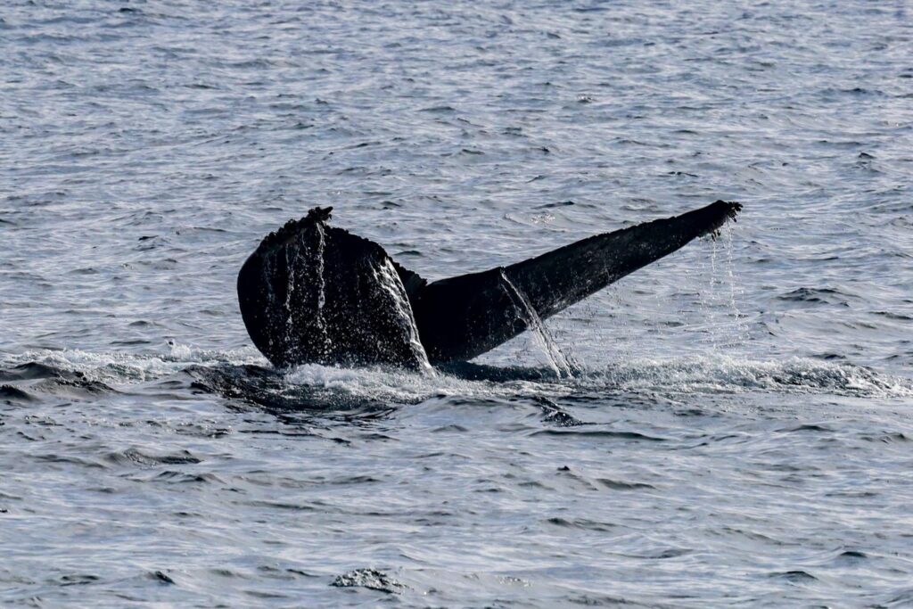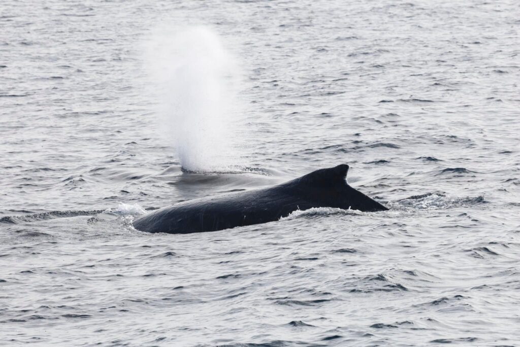 After the fog cleared, a couple of our guests said they saw something, which is always worth investigating, so we slowed down. After a few minutes, that “something” turned into a humpback whale, then two whales, and then three surfacing at once! Later a fourth humpback was seen in the group. The fourth humpback whale had a different dive profile and wasn’t doing the synchronized swimming and diving of the other three whales. We followed them for quite some time and noticed they were only staying down two minutes and traveling at around 5 knots or so.