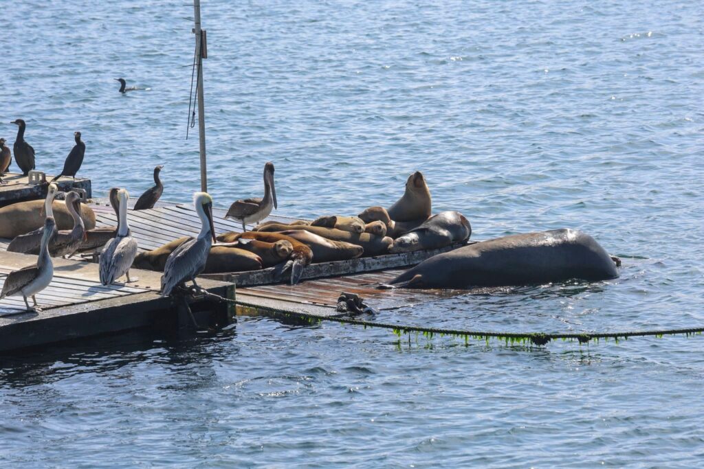 On our 4:00 PM Sunset trip, we had a few California sea lions showing us some interesting behavior, from resting, jugging, porpoising, cavorting and faux fighting at the start of our trip on or near the floating bait dock and the on top of the large, yellow mooring ball. These are gregarious, vociferous marine mammals that showed us a bit of jockeying for position and then taking a bit of a rest. They typically rest about 8-hours a day, about the same amount of time that humans like to rest.