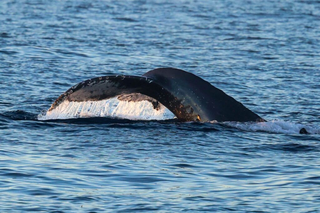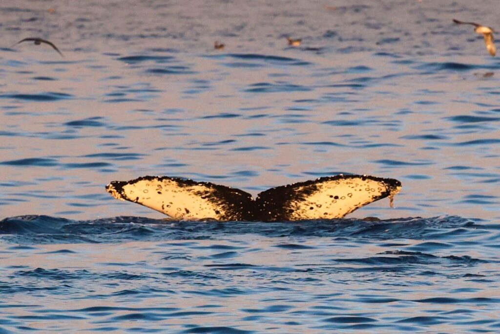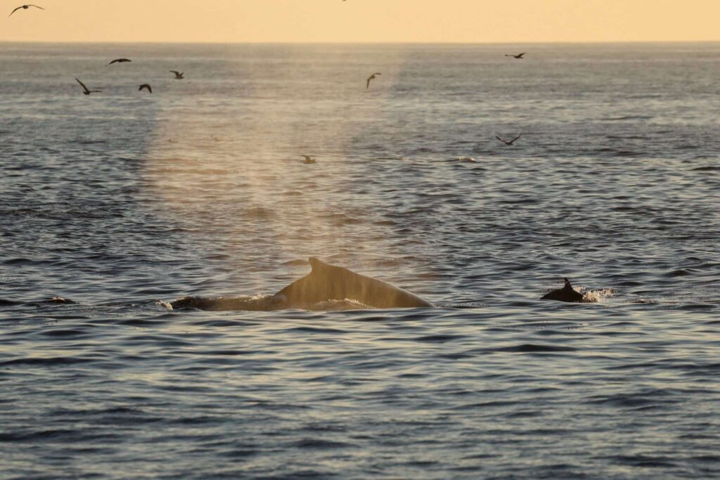 On our sunset trip, we cruised out and noticed a very dense and dark fog bank giving spooky vibes! It was coming from the south so we cruised north! We sighted a big bird pile up the coast and once we got there we sighted so many dolphins all around! We were racing against the fog and stayed with them as long as we could before the fog began to engulf our boat! We cruised out toward the west and a Minke whale was spotted just north of the birds. We waited a little longer and then a humpback was sighted by Captain Michael! We enjoyed amazing looks as it was down for about 3-5 minutes with 4 breaths. We loved to see its big puffy spout in the sunlight! Passengers lit up and screamed with excitement when we got to see its tail! We got lucky that the fog moved on and we had a nice opening and could enjoy the sunset!