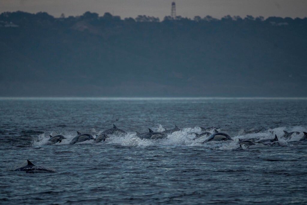 Spectacularly beautiful day on the water today! We headed out this afternoon and sighted a ton of birds off a few miles off the coast, near the drop. When we got there, we found THOUSANDS of dolphins, some tightly packed together – some more spread out but ALL zooming about havin a blast! When this evening rolled around, we headed out with gorgeous cloud cover, glassy seas and endless visibility! We immediately sighted TWO pods of dolphins, one of bottlenose, and some commons in the other direction.