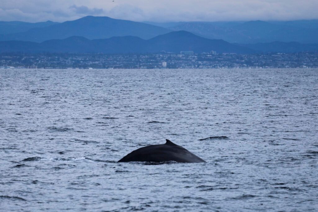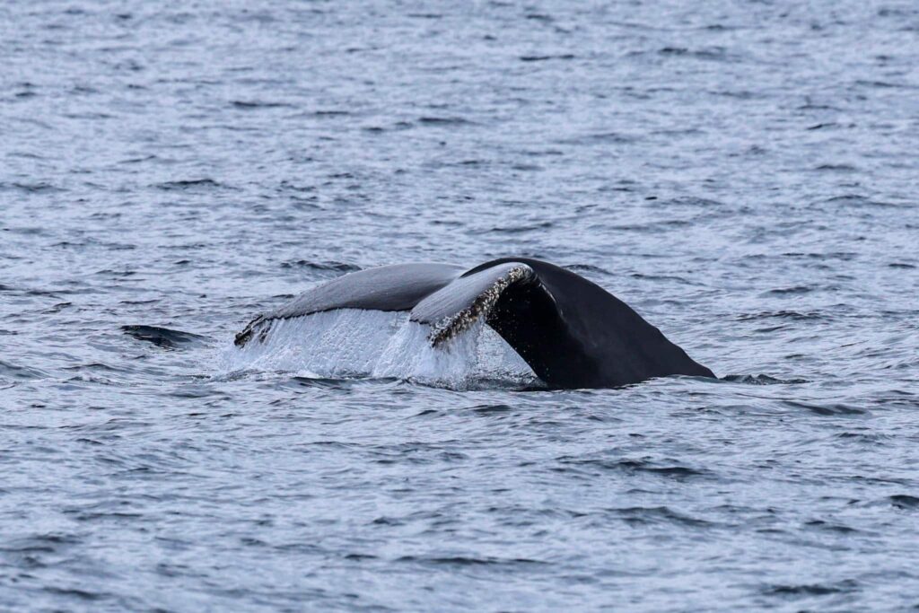 We had a whale of morning trip! Out to the west we noticed a massive spread of thousands of birds! They were diving indicating they were feeding. Once we got to the drop-off, we spotted a small pod of ~25 Offshore bottlenose dolphins! They were moving quickly to the north. We noticed their small puffy spouts as they came up for breaths. There were a few cow/calf pairs that were fun to look out for as they leaped playfully near our boat! We observed bow-riding and surfing next to our boat! Captain Bryan noticed some larger spouts to the west of us! We hung out with 3 Humpback whales! We didn’t know it at the time as there were only 2 up at a time while we observed them, but the photos revealed three! There were two smaller likely sub-adults, one with a nick in the dorsal fin and a third larger one hanging out together! We got to see their tails and as they went on short 3-5min dives!