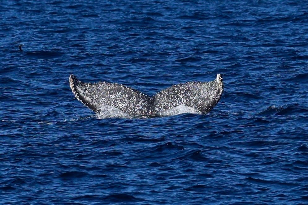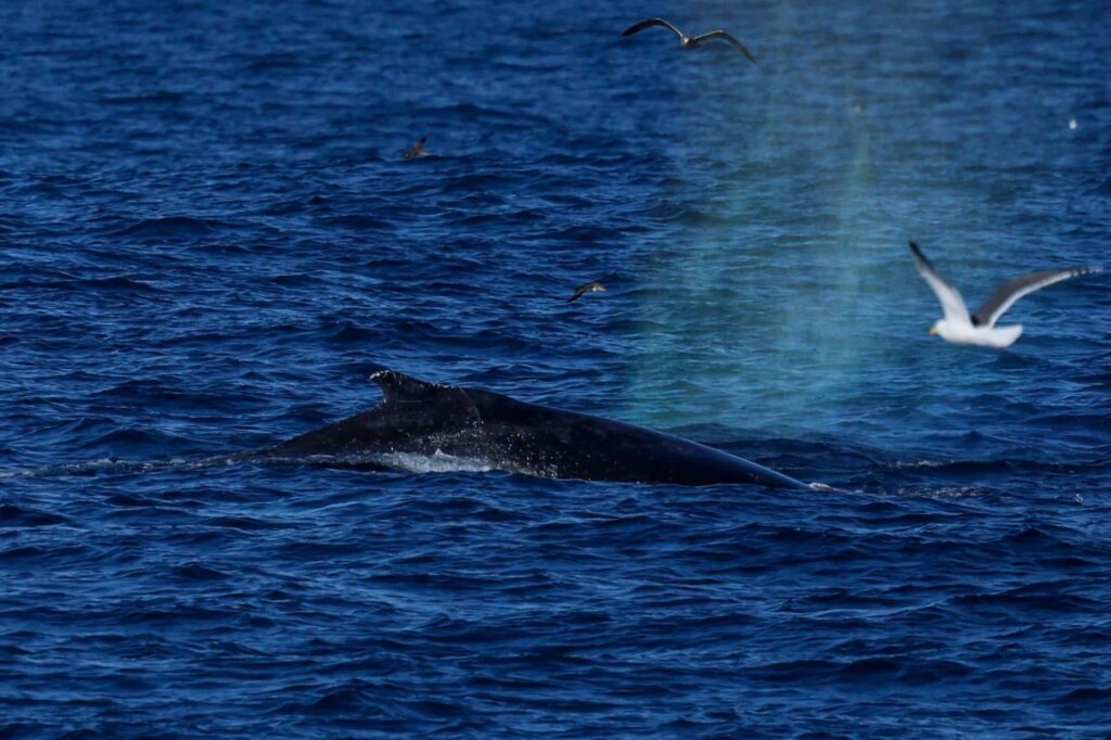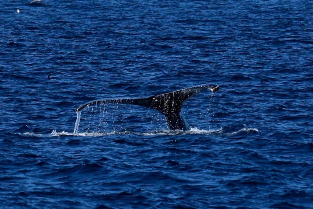 After turning back towards the coast and encroaching the drop off, we got super lucky seeing a series of spouts from multiple whales! A quad-pod of humpbacks showed up making a splash! We got to see a full breach from one, and some definite competition pod behaviour. Lots of flukes on dives all around.