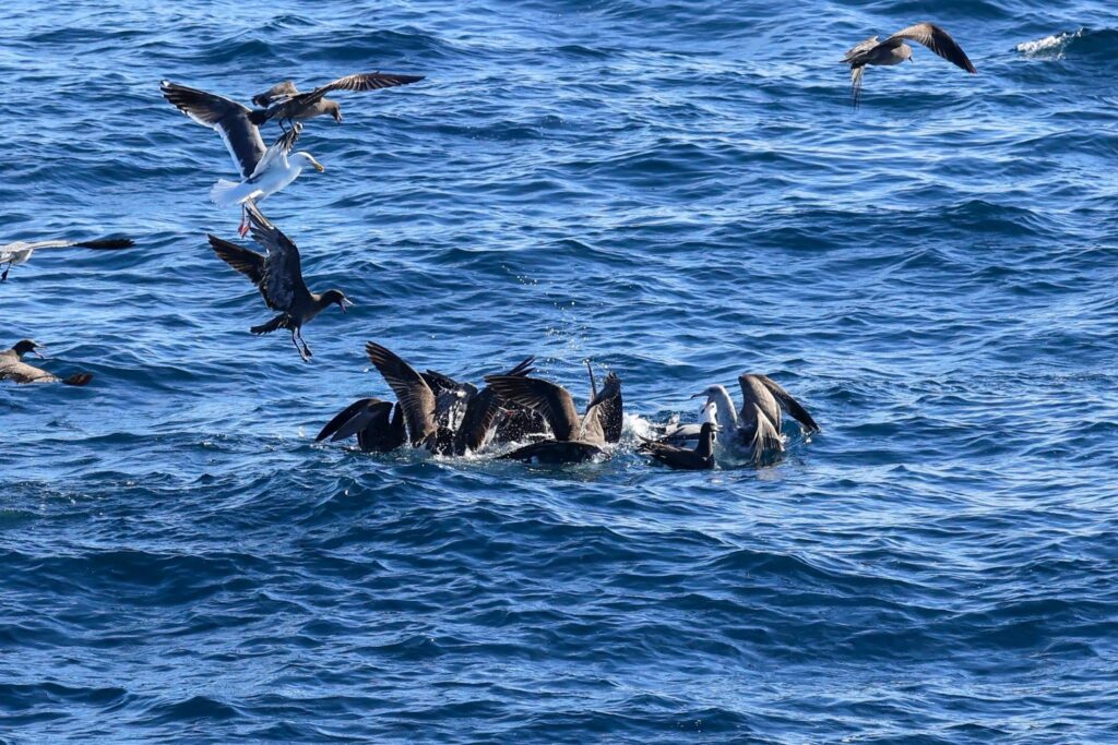 Beyond the drop-off about 11 miles from Mission Bay we followed enormous bird piles of pelicans and black vented shearwaters just resting upon the surface of the Pacific to an energetic pod of ~300-~400 long beaked common dolphins! We got to watch these tri-coloured dolphins hunting among the birds and it turned into a full blown feeding frenzy! This of course, it the ideal circumstances for a hungry, hungry humpback to show up, and right on cue, a spout appeared in the mix.