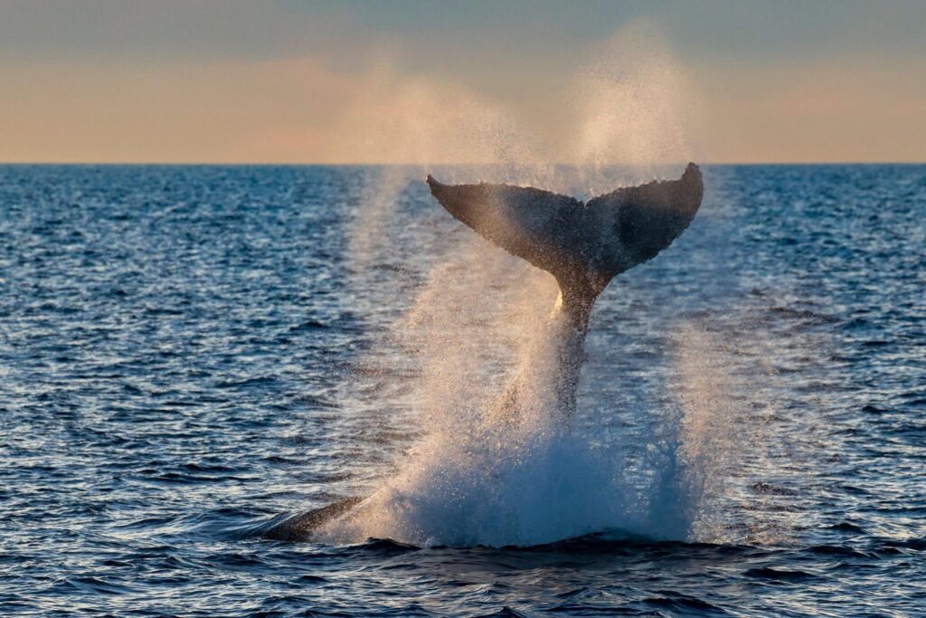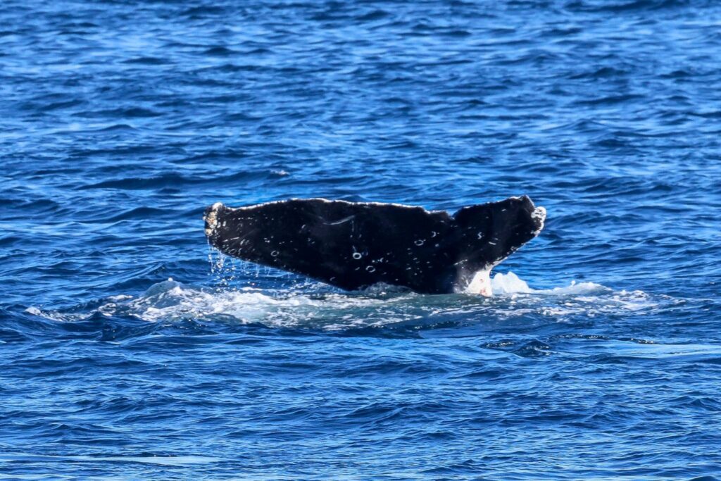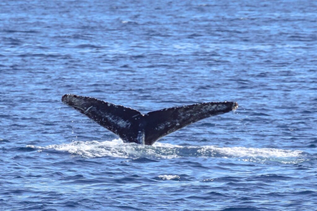 “We’re gonna need a bigger boat”, many of us thought, as the whale turned-around and headed right underneath our boat, which was idling in 800-feet of water. This is what we call a “friendly” whale. Our whale started doing tail throws, creating huge splashes.