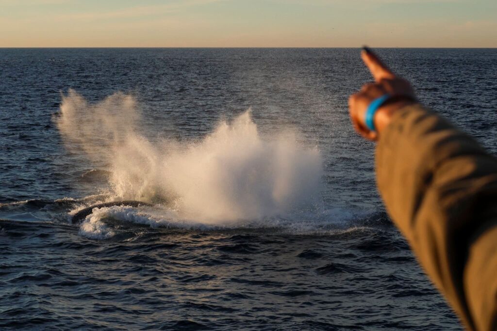 We got into deeper water and saw about 400 long-beaked common dolphins, many of them taking a break from foraging to come play with our vessel. Then we heard “there she blows” from a few guests, as a humpback whale surfaced right in front of our boat.