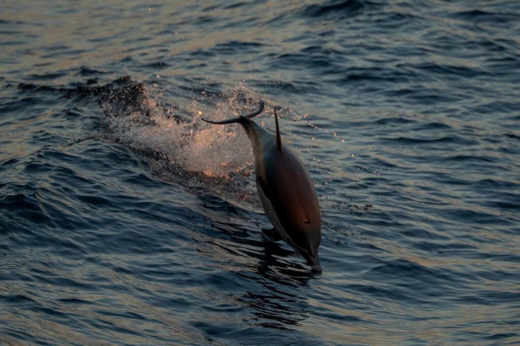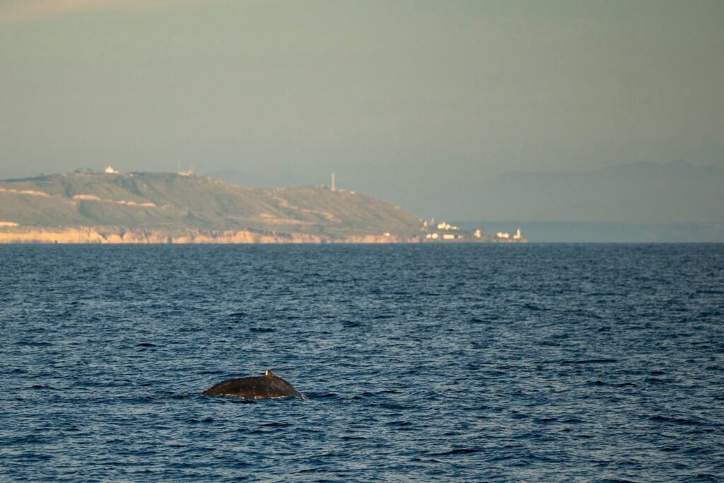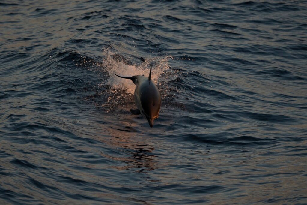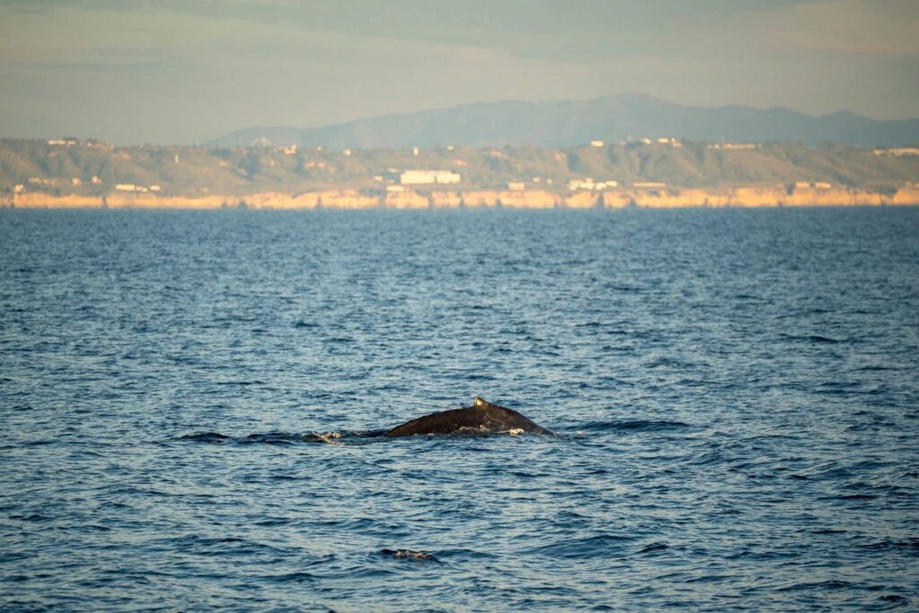 . This afternoon, we had glistening seas and hundreds of common dolphins off the drop off, but as the day went on it got even better. This evening, we got it all. We headed out in the direction we heard there were some baleen whales lingering earlier in the day. We searched and searched… with a whole lot of nothing – until we got out out past the drop. We found a humpback whale cruising southbound to Mexico at 6kts! We got tons of good looks before heading out even further- for even more fun. The whole horizon was alight with glimmering dolphin splashes backlit by the setting sun. We ended our trip with a stunner of a sunset, and dolphins escorting us back to the coast line.