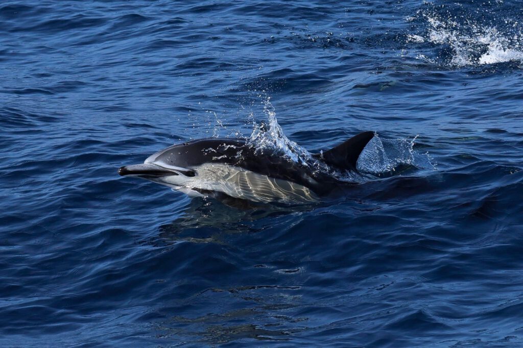 We went 10-miles offshore and found around 300 short-beaked common dolphins foraging on dispersed fish. They came over to play with our vessel and looked at us as much as we looked at them.