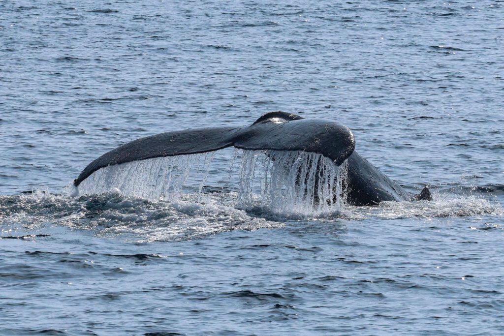 On our way back, Captain Michael found 2 humpback whales that seemed to be in a hurry to migrate down to its breeding grounds in Mexico or Central America. We got some good looks. We have one more trip today. See you soon, whale watchers. —Biologist Greg McCormack