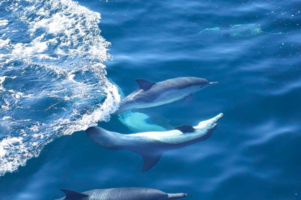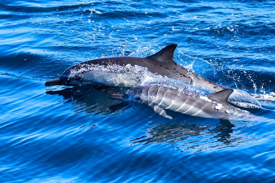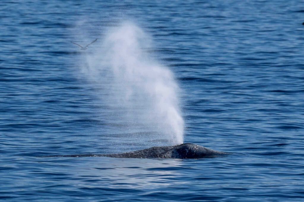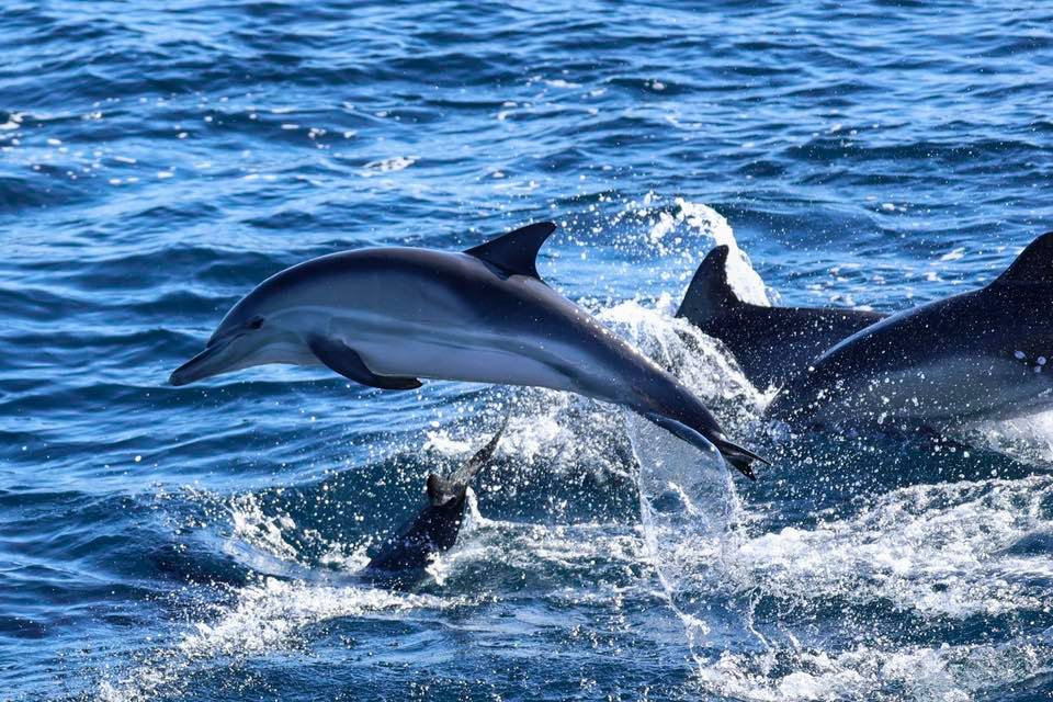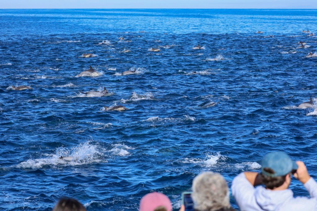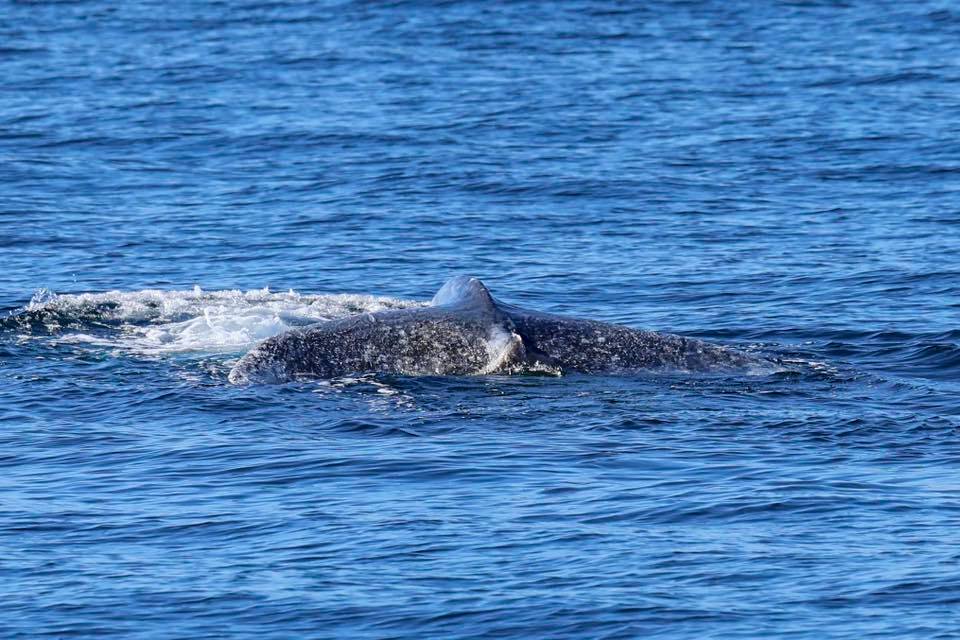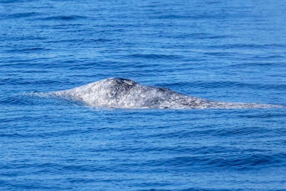 We had an amazing morning with our second sighting of Gray whale! We also enjoyed a super fun and energetic pod of ~400 Long-beaked Common dolphins! To start our trip, we cruised out of the Mission bay jetties and only half a mile from shore we enjoyed catching up with a single southbound Gray whale! We got great looks as it surfaced for 3-4 breaths and went down for 4-5 min dives! We got slight glimpse at its beautiful tail a few times. We waved goodbye to our new Gray whale friend and continued out and caught up with a huge, fast-moving pod of ~400 Long-beaked Common dolphins! Once we were about 1/2 a mile away, they began to stampede toward us! It was absolutely exhilarating as they raced all around our boat! Many passengers were squealing with excitement! We enjoyed watching the cow/calf pairs leap out of the water beside us! There were some cheeky show-off dolphins too! We ventured up the coast in search for more and at the same time took in the sights!
