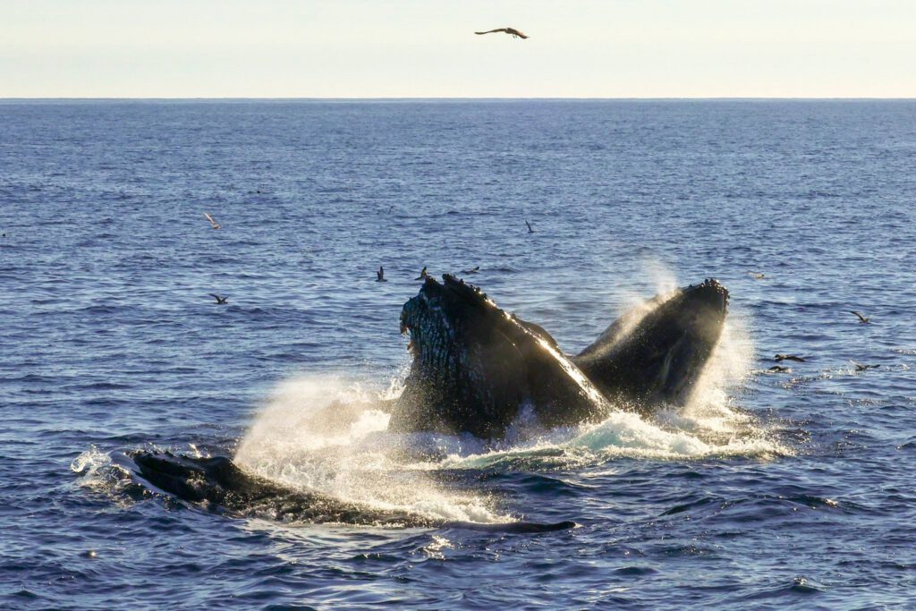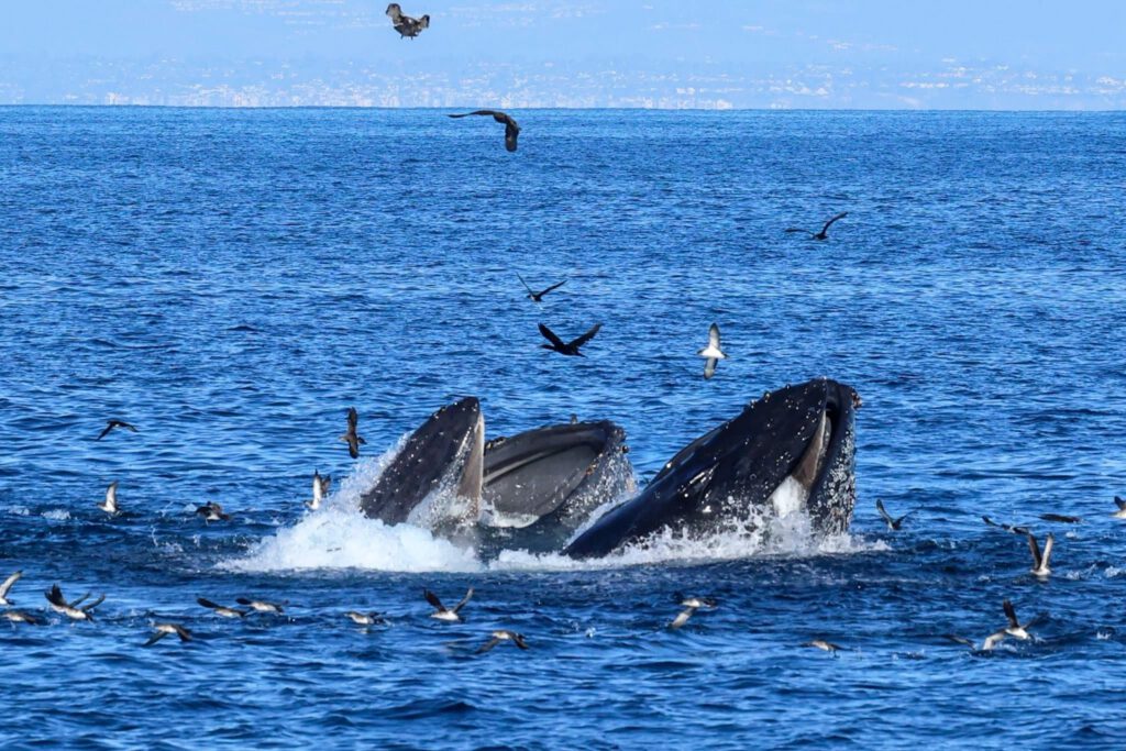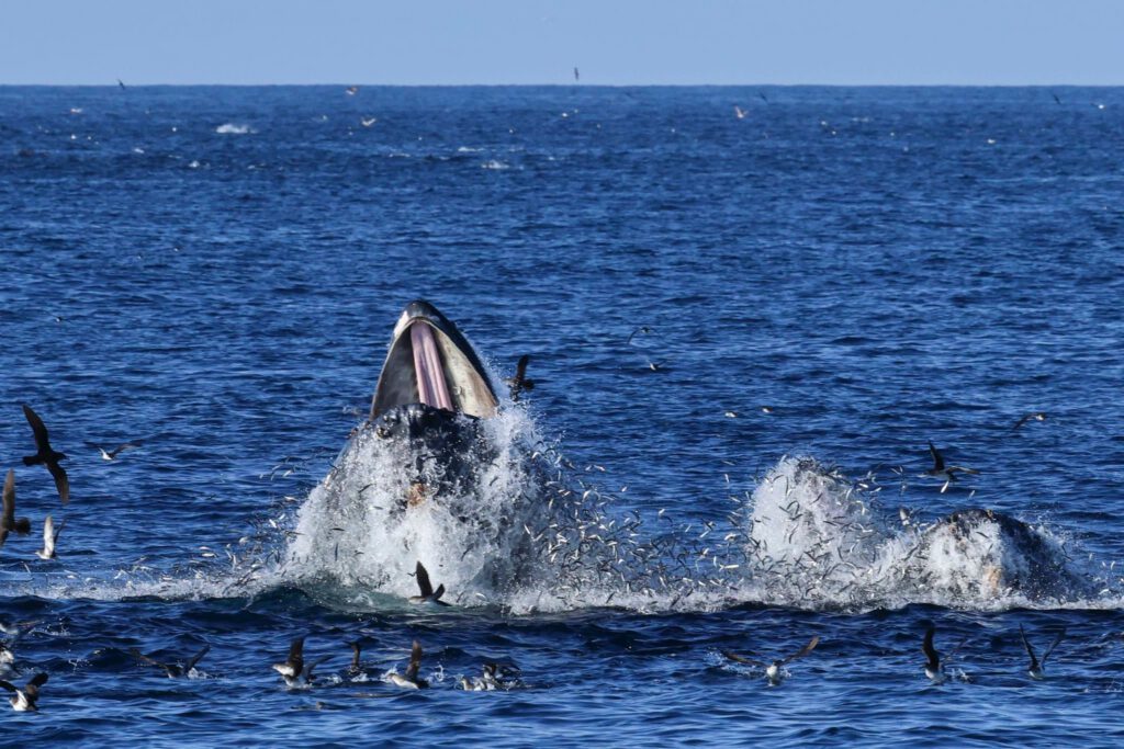 This feeding frenzy went on for over 30 minutes, and we got to see some unbelievable looks at the insides of humpback whales’ mouths, at their baleen plates, and tongues! It was so impressive. We also witnessed a pod of ~500 long-beaked common dolphins, also in the area, corralling the massive bait balls of tiny schooling fish, which the dolphins, whales, and birds were all feeding on.