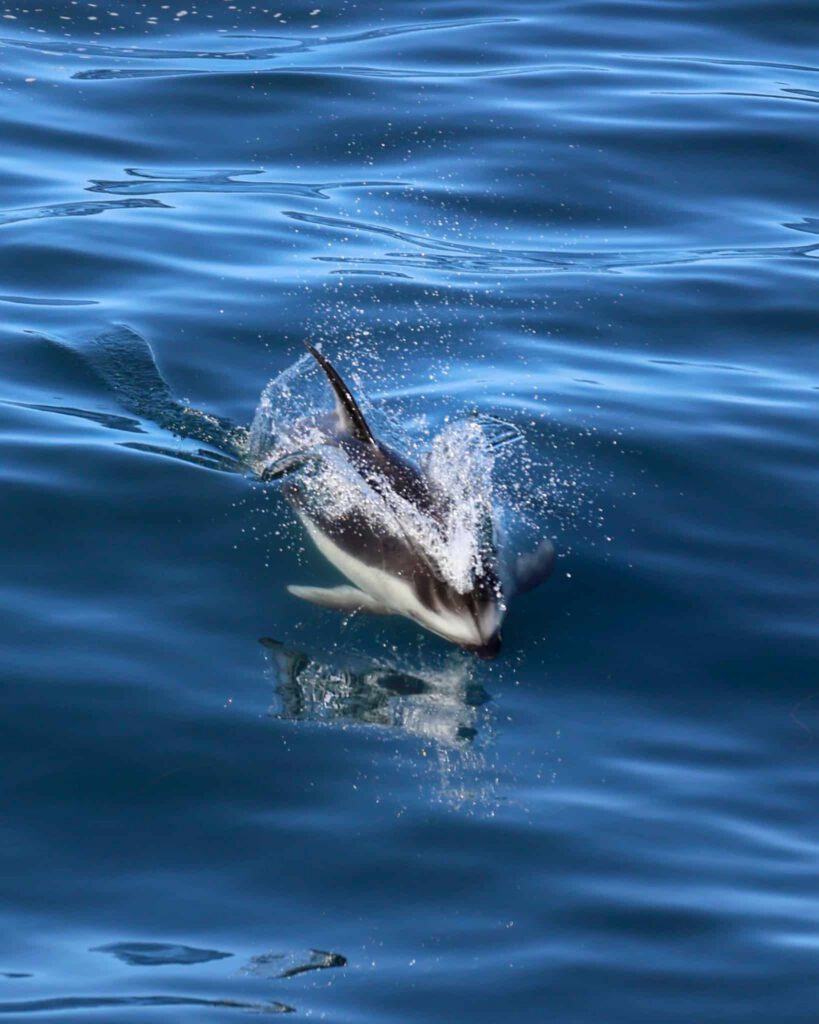 What a STUNNER of a day! Our sunset trip kept up with the vibe of the day, we headed out and IMMEDIATELY- and i mean less than a mile from shore – sighted a gray whale. We cruised south with this snorkeling gray for some time but, we’d already sighted a towering spout on the horizon so we went to investigate. We found one of the two fin whales from earlier, and just beyond that fin, HUNDREDS of common dolphin. After we got our fill of the fin, we set out to the dolphin dappled horizon. The common dolphins cruised along in our wake having LOADS of fun surfing. Right before we made it back to shore, we got more pacific white sides! These curious dolphins are always a treat, especially since we see them so rarely.