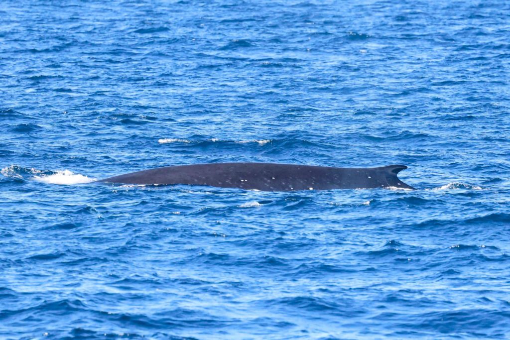 For our sunset trip, we got out beyond the drop-off and found a large, scattered pod of long-beaked common dolphins followed by some good looks at a Fin whale. The fin whale dove down for 7-minute dives and came up several times further away than expected on its feeding forays.