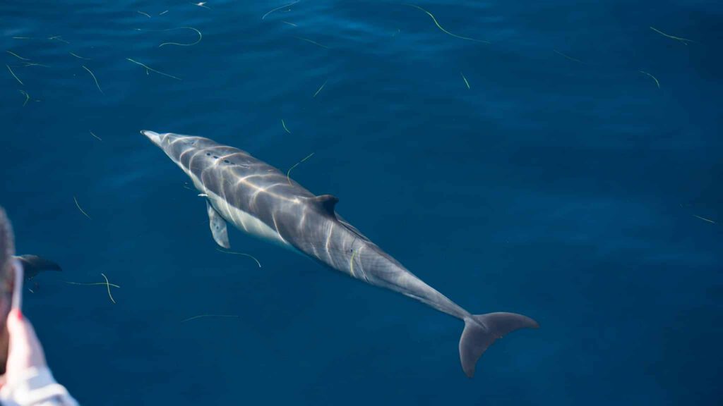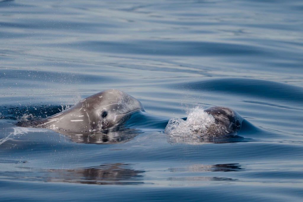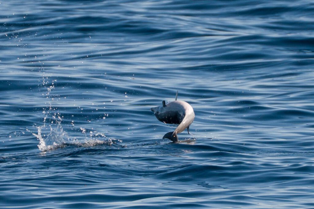 A SMORGASBORD of species today! This morning, we headed out into deeper water and relocated the pod of Risso’s dolphins that seem to be hanging around the last few days! This pod looked even bigger than it did the last few days, like they’re putting the word out that we have got eatin here in SD! 300- 400 individuals spread out over a mile of ocean this time.